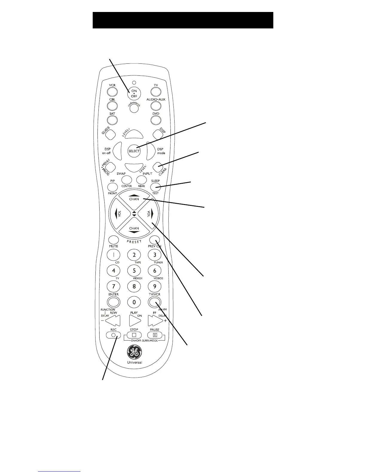 RECORD, PLAY, STOP, REW, FF, PAUSE VCR control buttons