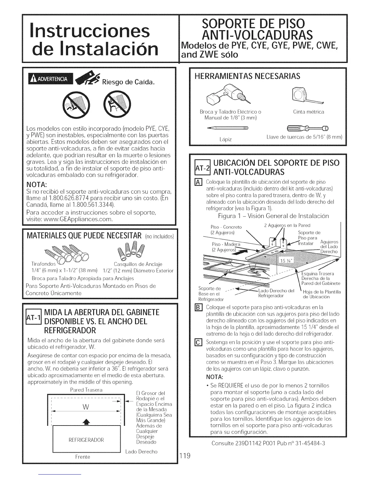 ancho, W, no deberia ser inferior a 36". El refrigerador sera