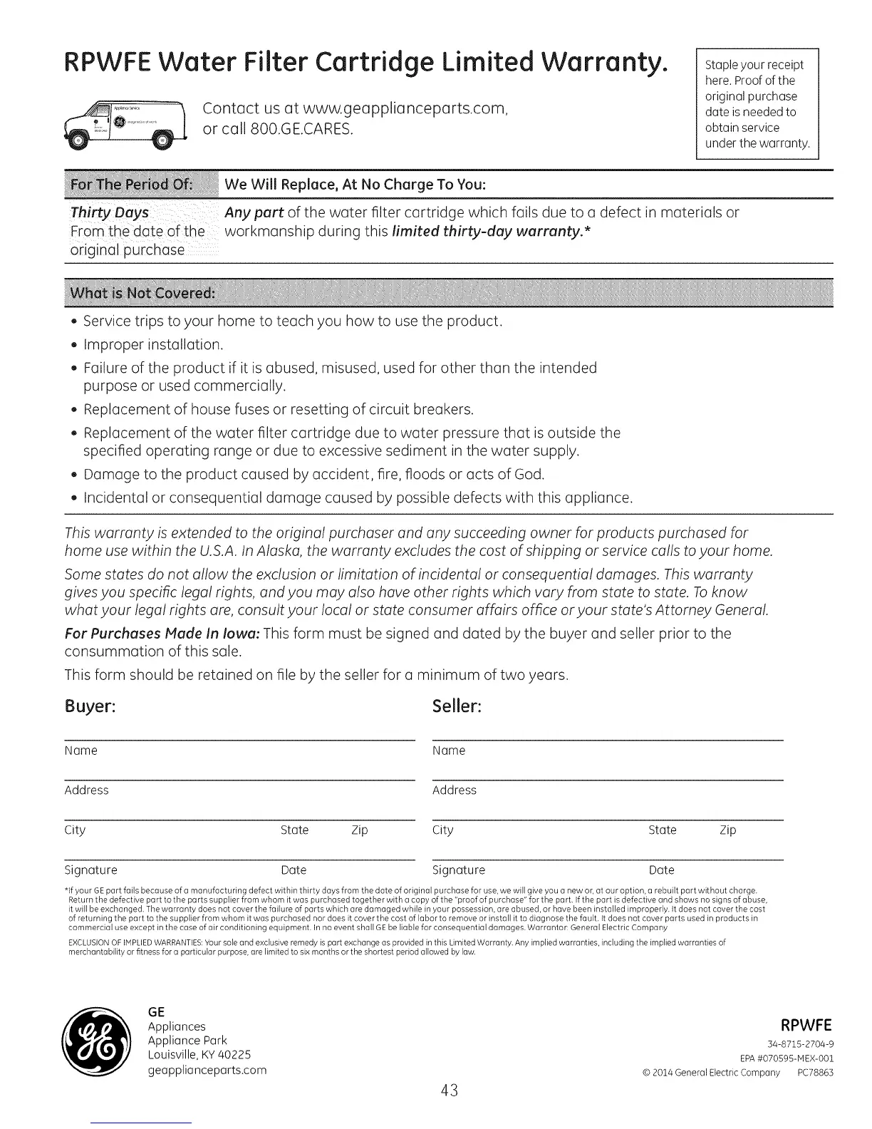 *If your GEpart fails because of a manufacturing defect within thirty days from the date of original purchase for use, we will give you a new or, at our option, a rebuilt part without charge.