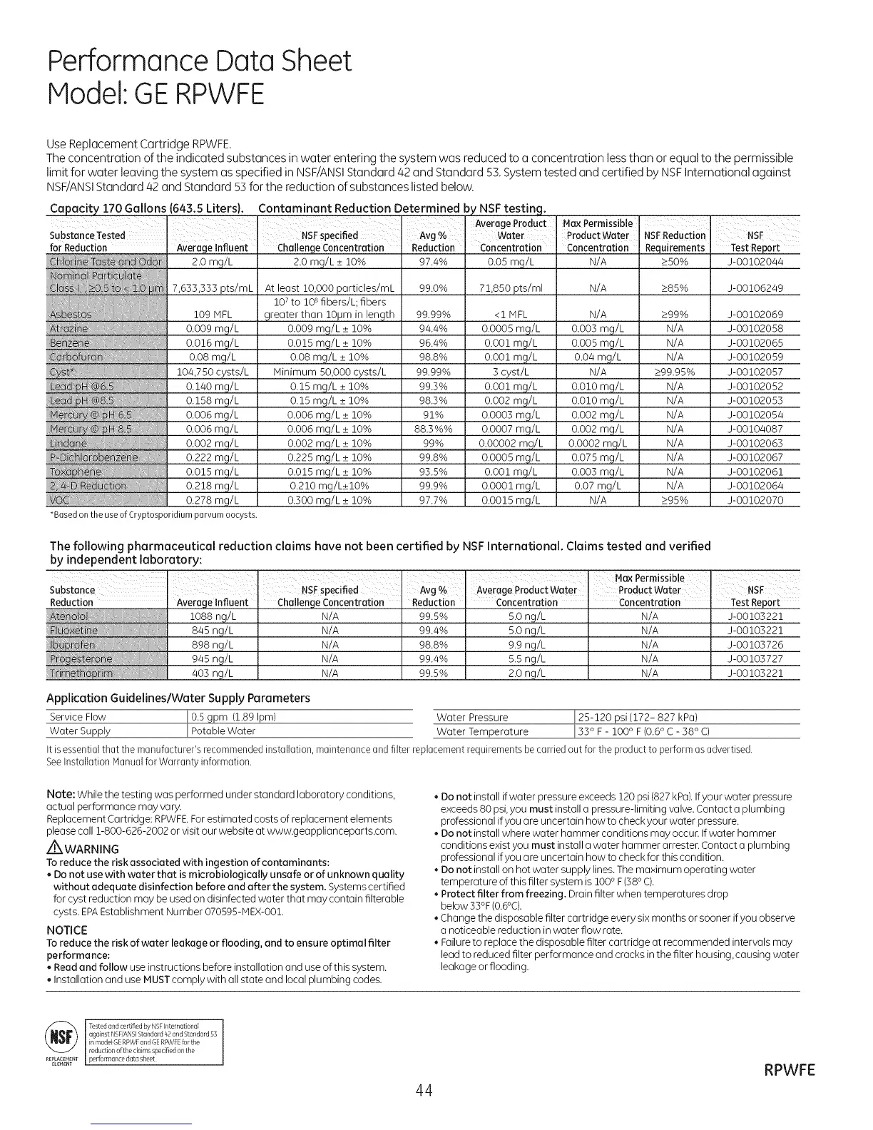 limit for water leaving the system as specified in NSF/ANSIStandard 42 and Standard 53.Systemtested and certified by NSFInternational against