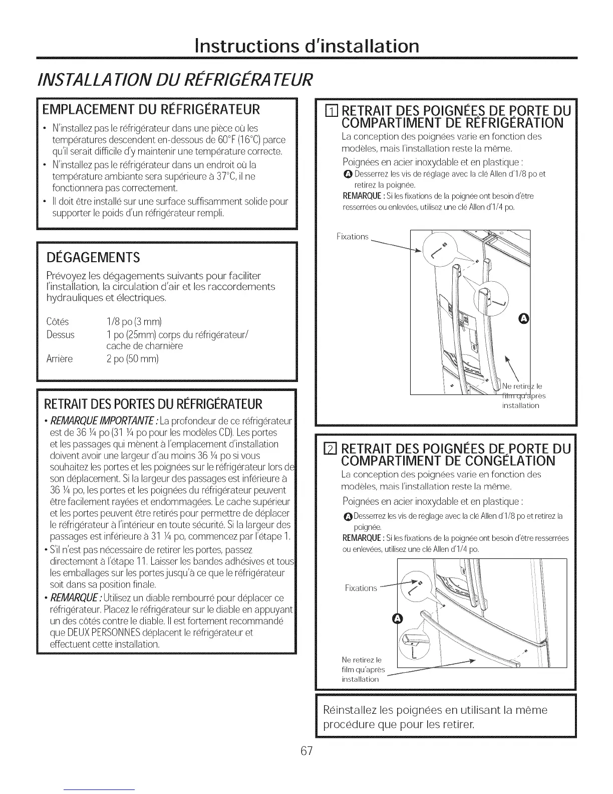 36 1/4po, lesportes et les poigneesdu rdrigerateur peuvent