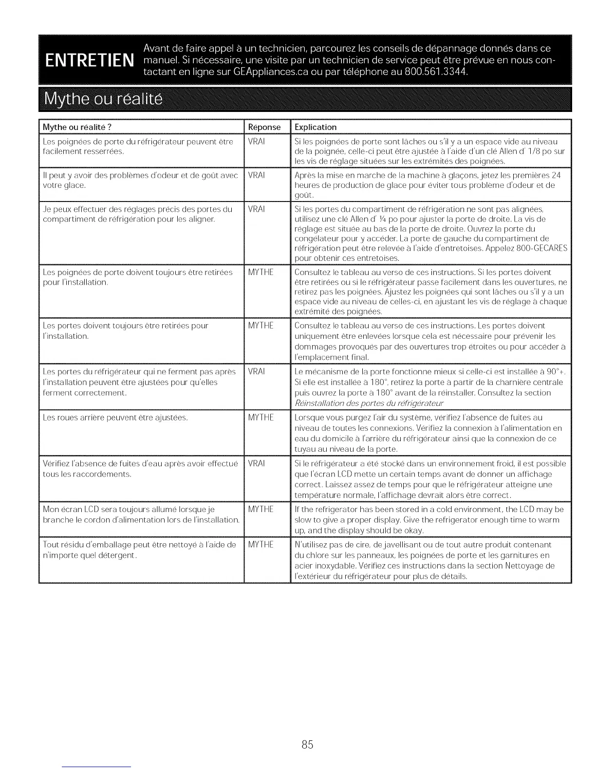 refrigeration peut etre relevee a I'aide d'entretoises, Appelez 800-GECARES