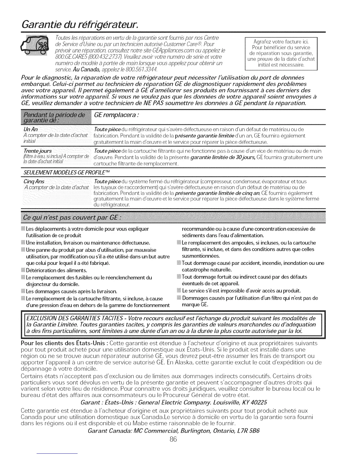 apporter I'appareil a un centre de service autorise GE. En Alaska, cette garantie exclut le coot d'expedition ou de