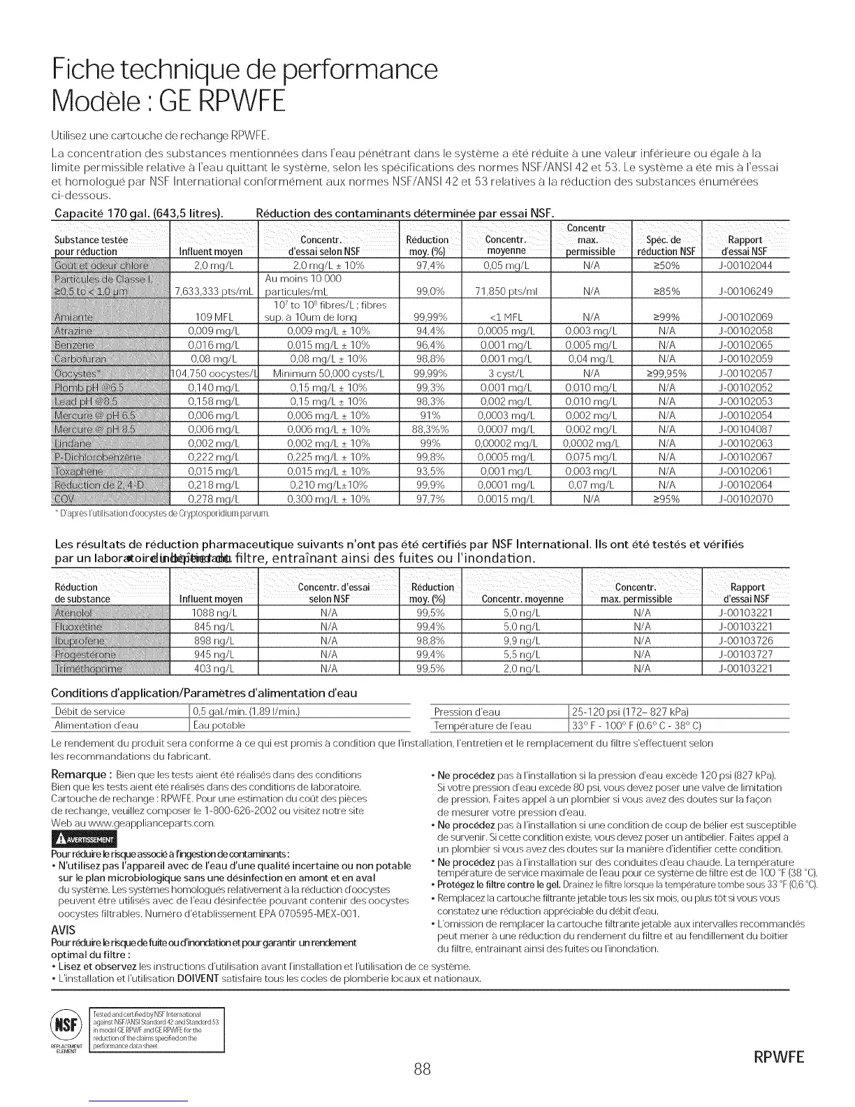 limite permissible relative a I'eau quittant le systeme, selon les specifications des normes NSF/ANSI 42 et 53, Le systeme a ete mis a I'essai