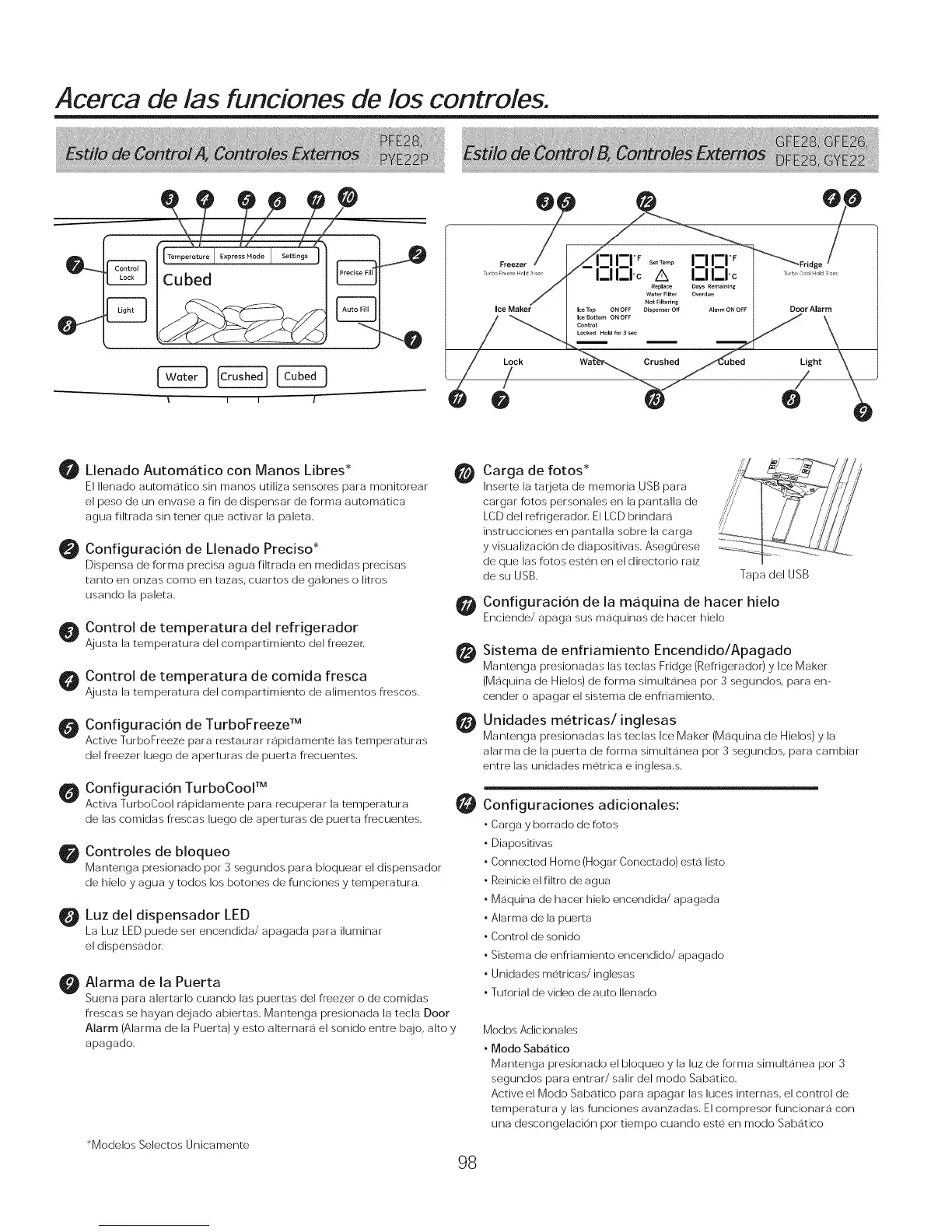 de hielo y agua y todos los botones de funciones y temperatura.