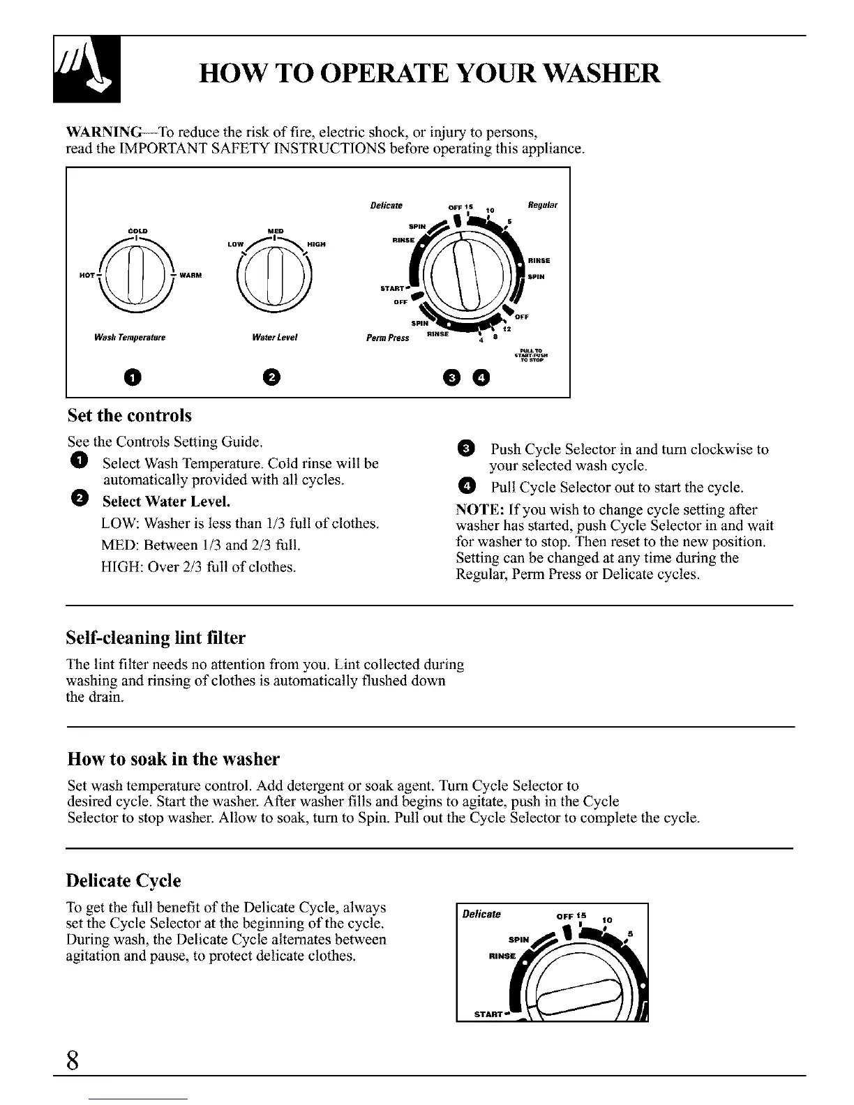 Selector to stop washer. Allow to soak, turn to Spin. Pull out the Cycle Selector to complete the cycle.