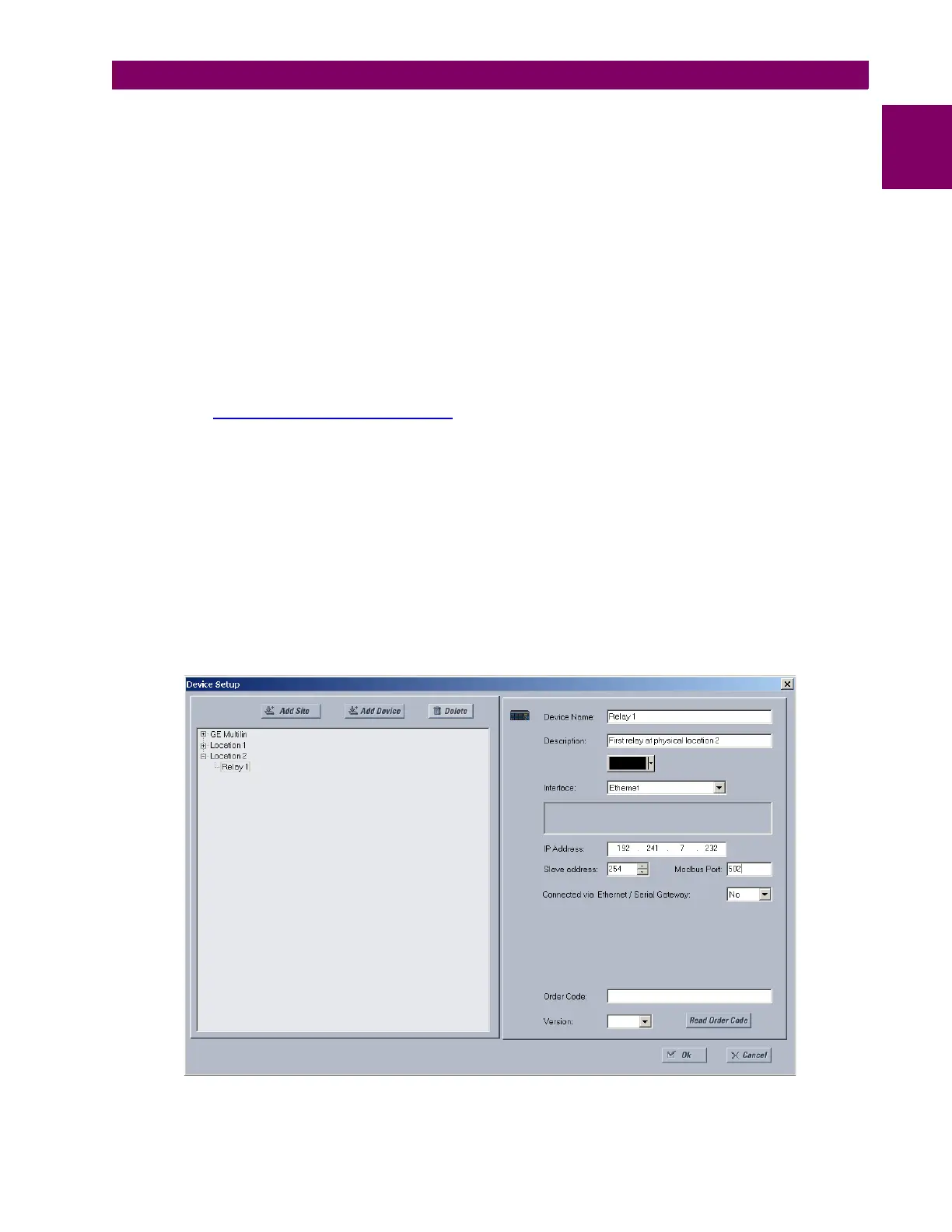 5. The new site appears in the upper-left list in the EnerVista UR Setup window. Click the Device Setup button then