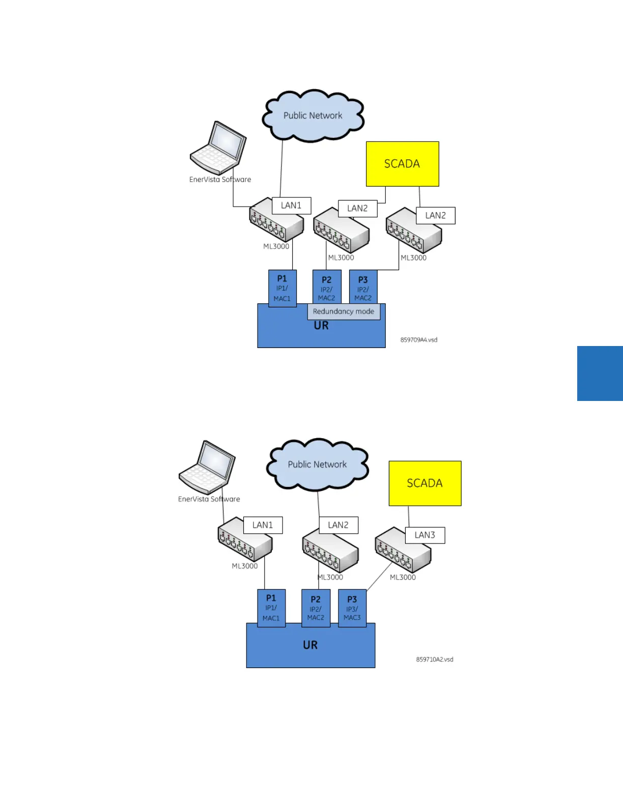 The following topology provides local configuration/monitoring through EnerVista software on LAN1, to which port 1 (P1) is