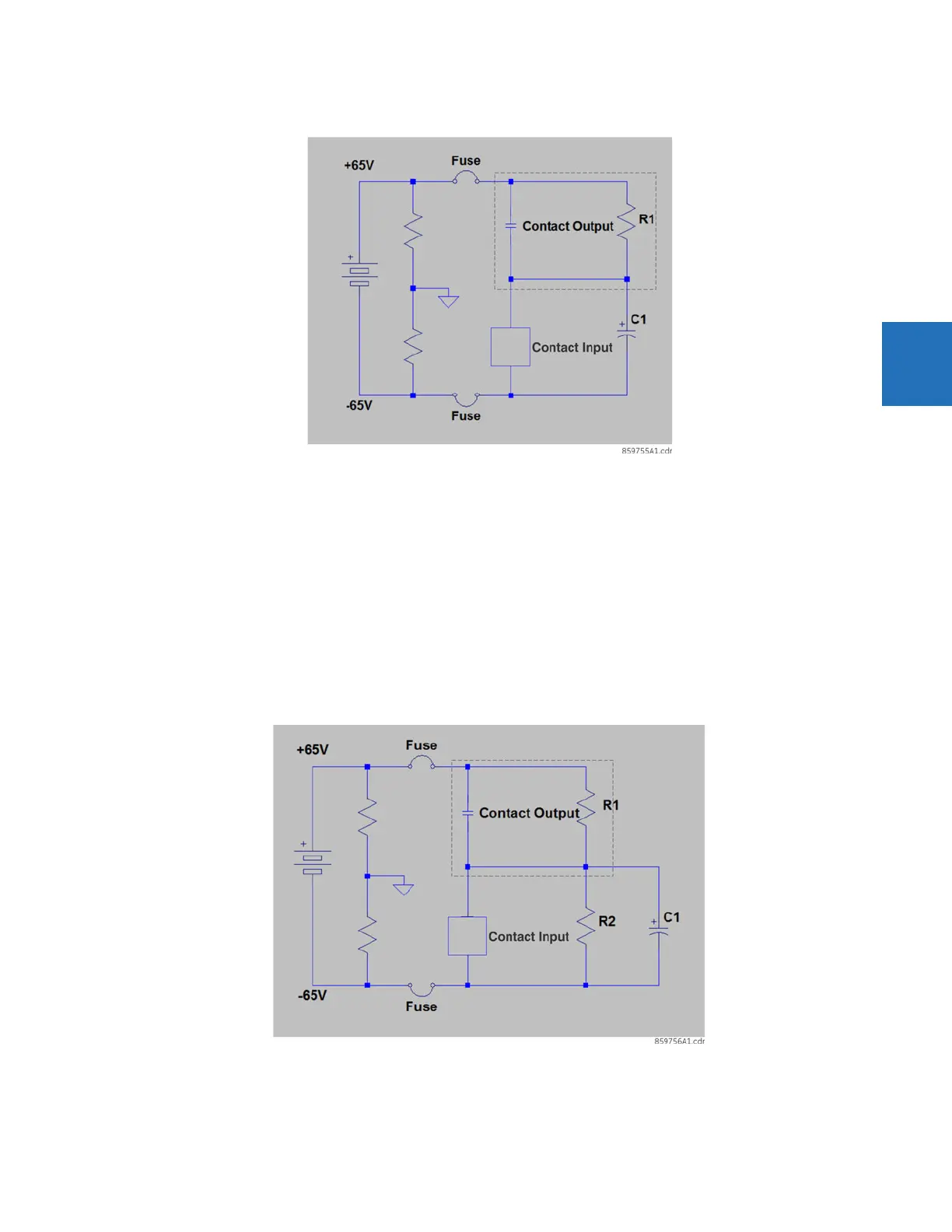 Figure 3-21: Contact input connected to a contact output with resistor (R2) across the input