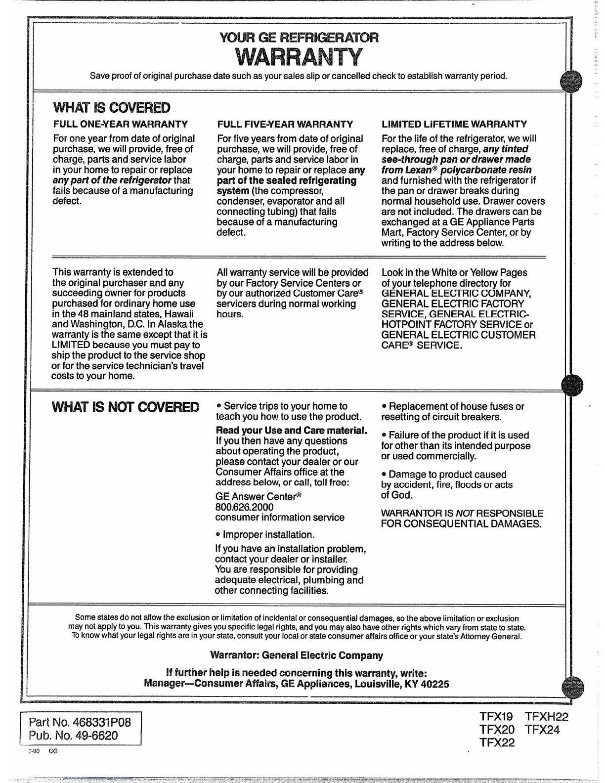 GE TFX22K - YOUR GE REFRIGERATOR WARRANTY; Full One-Year Warranty; Full Five-Year Warranty; Limited Lifetime Warranty