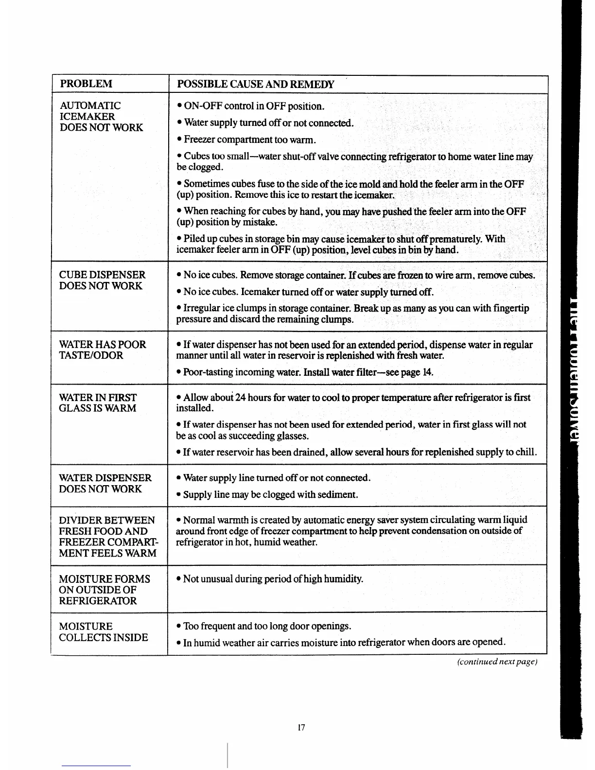 ● No ice cubes. Icemaker turned off or water su~ly turned off.