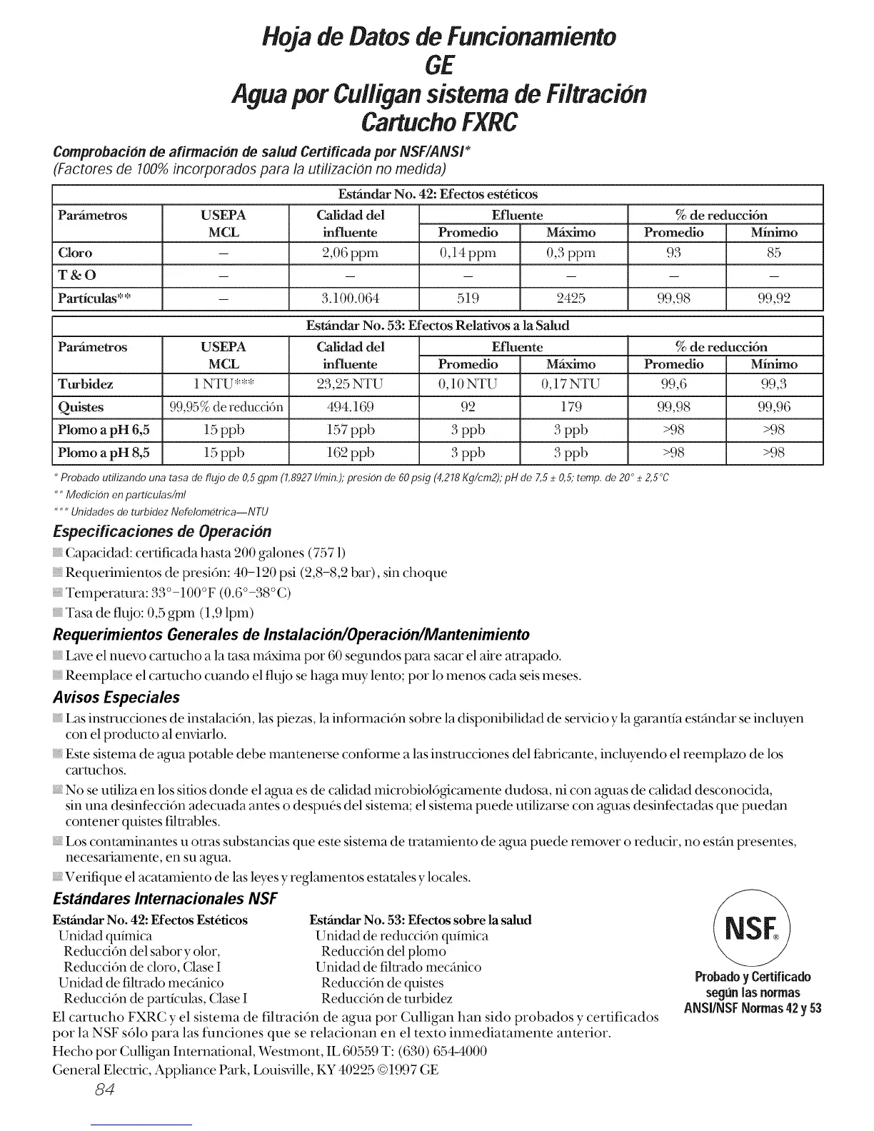 Probado utilizando una tasa de flujo de 0,5 gpm (1,8927 I/rain.); presion de 60 psig (4,218 Kg/cm2); pH de 7,5 +_0,5; temp. de 20 ° +_ZS°C