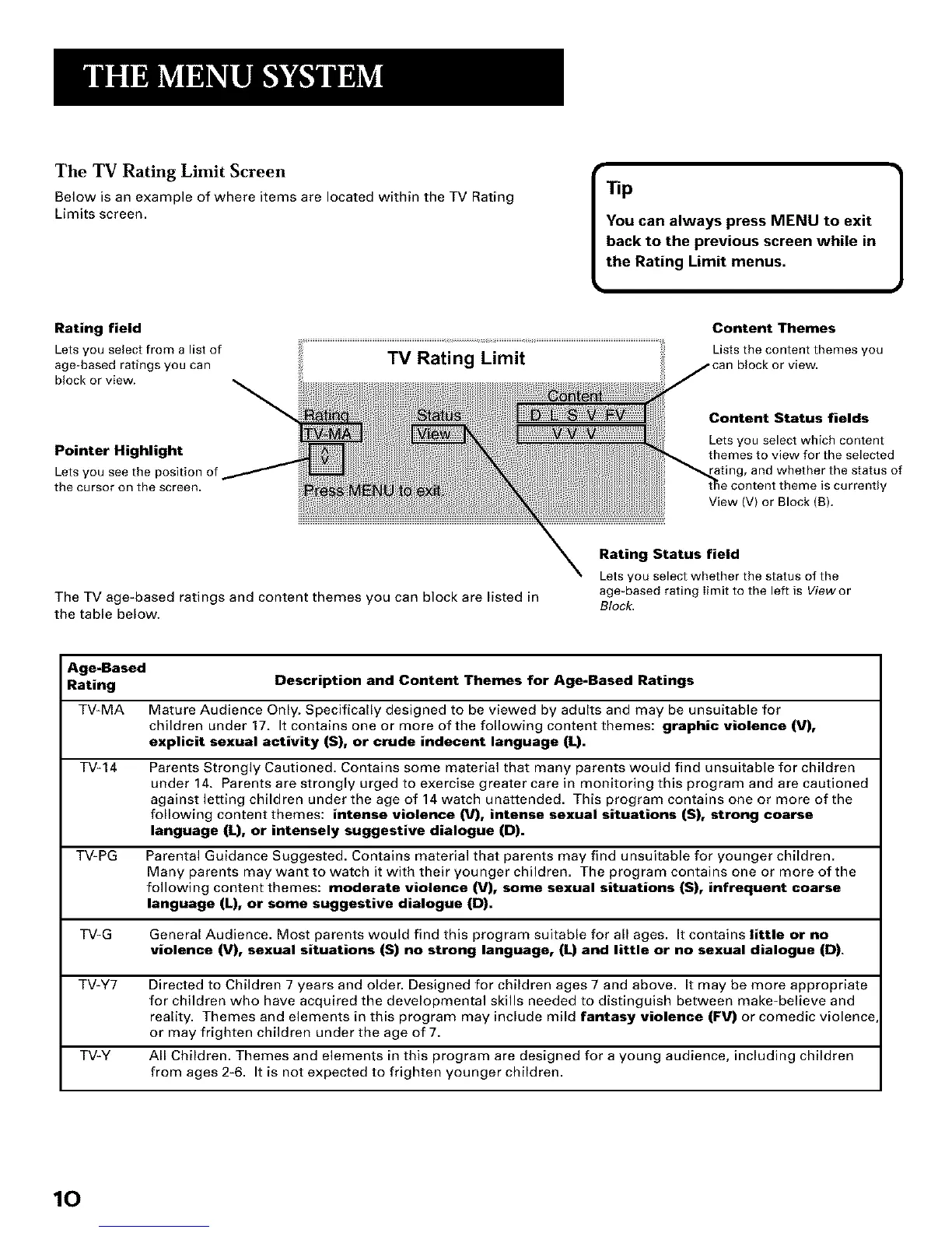 The TV age-based ratings and content themes you can block are listed in