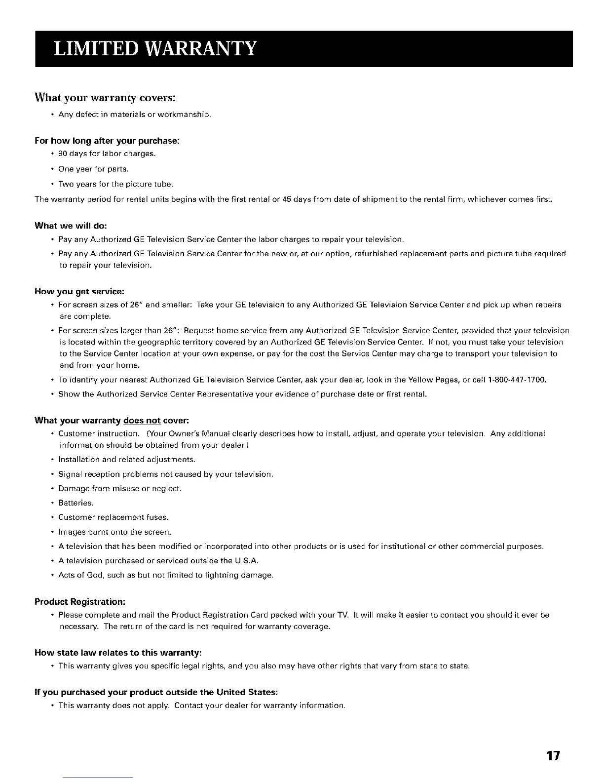 • Pay any Authorized GE Television Service Center the labor charges to repair your television.