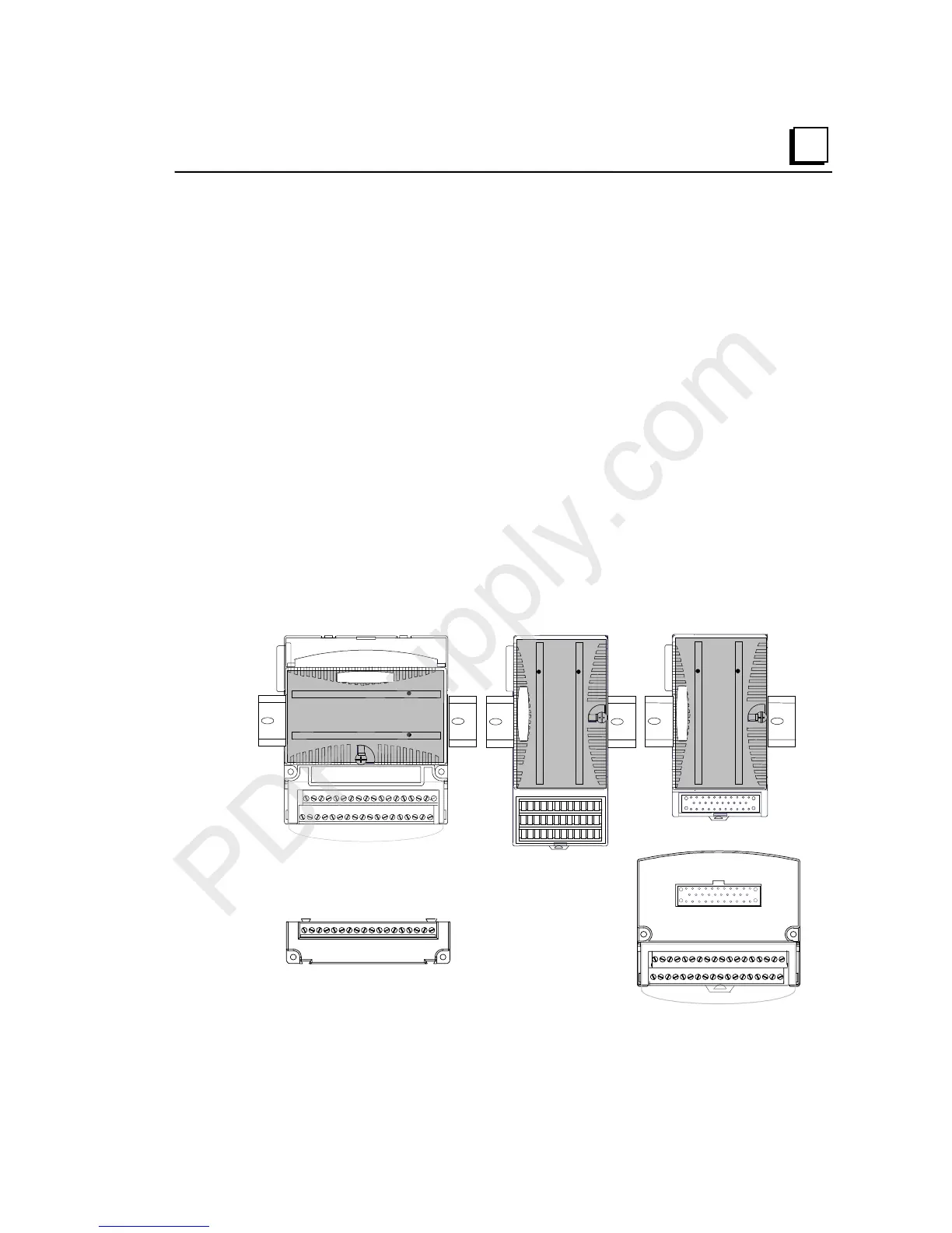 Terminal-style I/O carriers. Modules mount parallel to the DIN rail.
