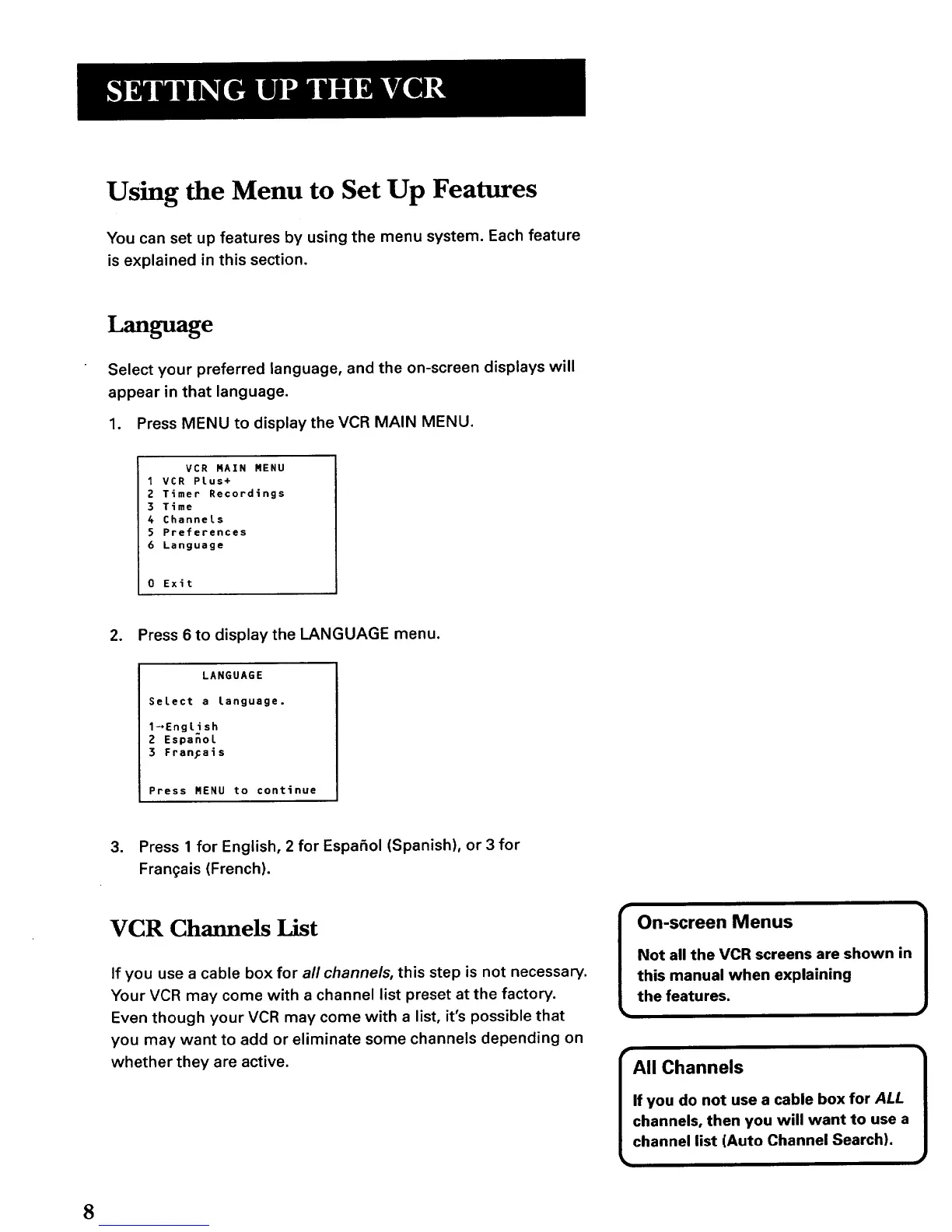 Not all the VCR screens are shown in
