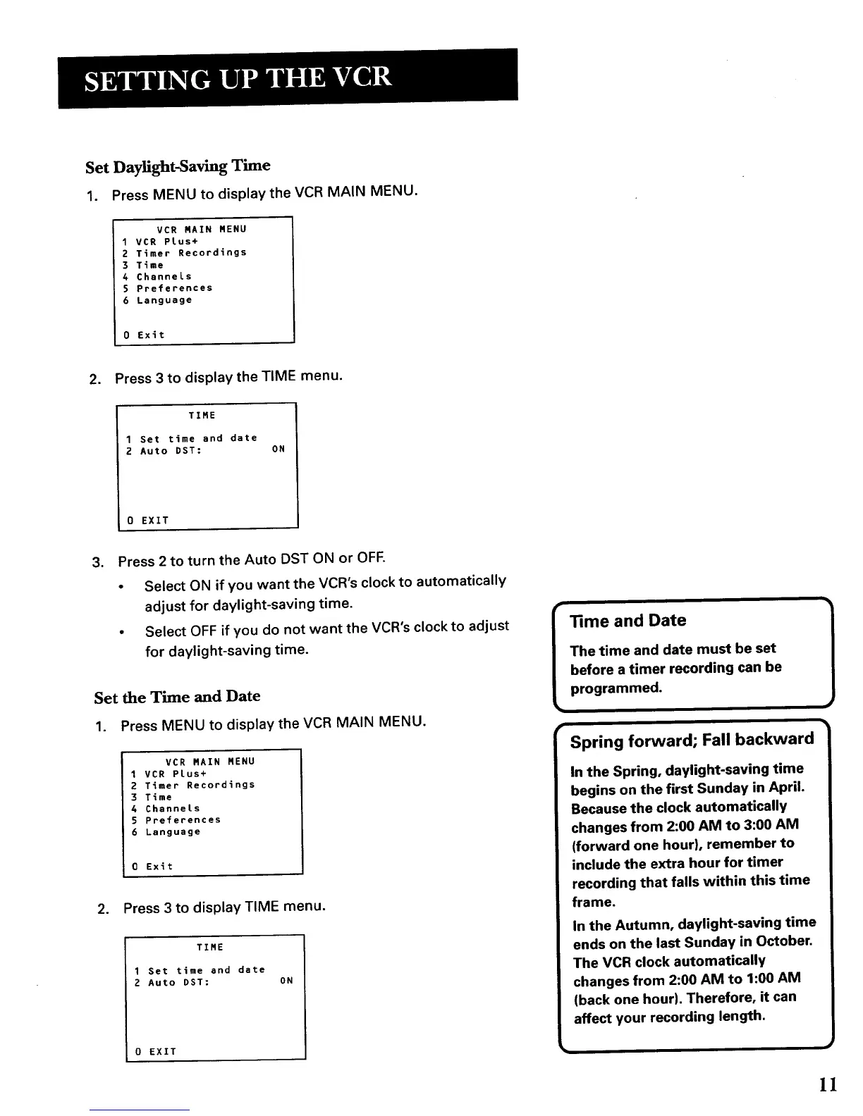 1. Press MENU to display the VCR MAIN MENU.