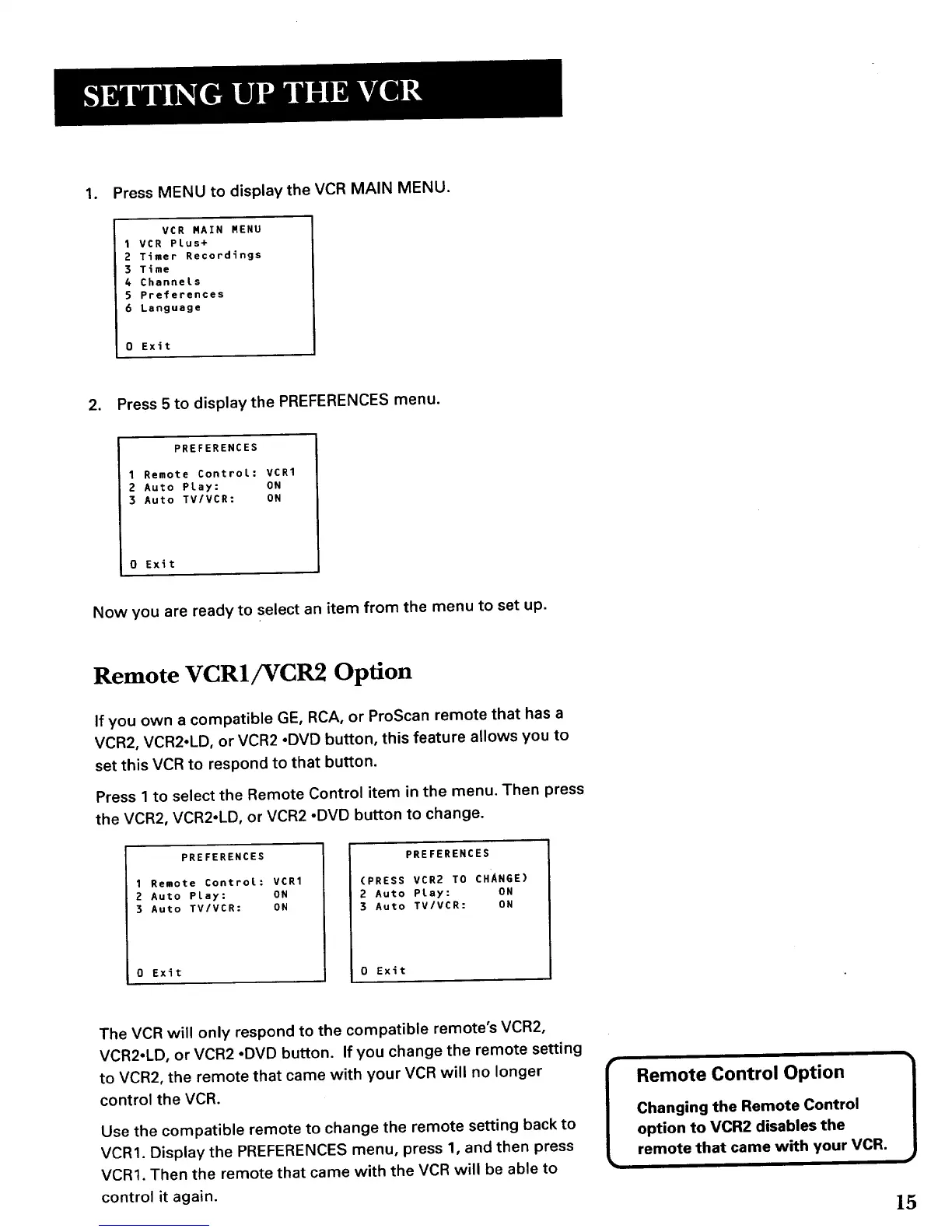 VCR1. Display the PREFERENCES menu, press 1, and then press