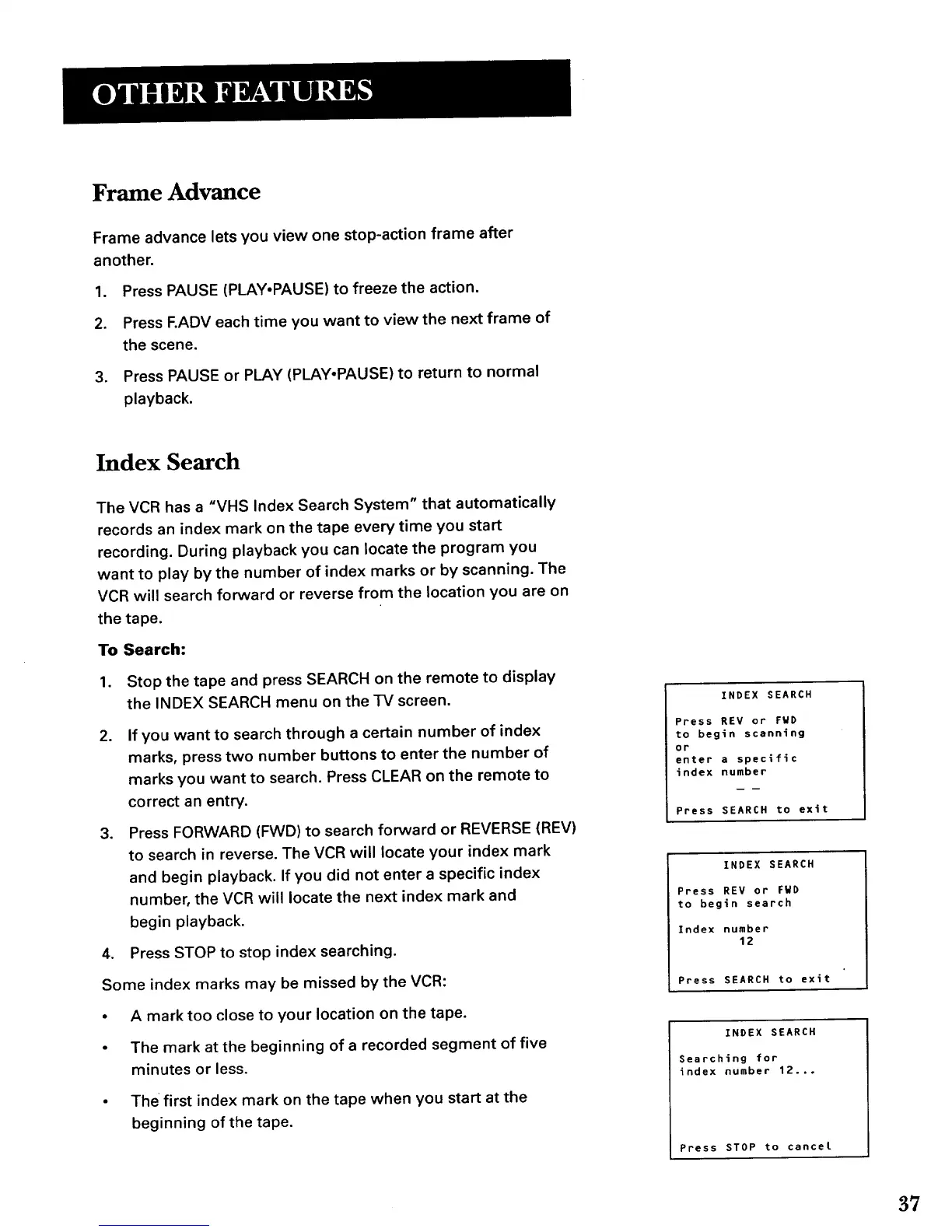 number, the VCR will locate the next index mark and