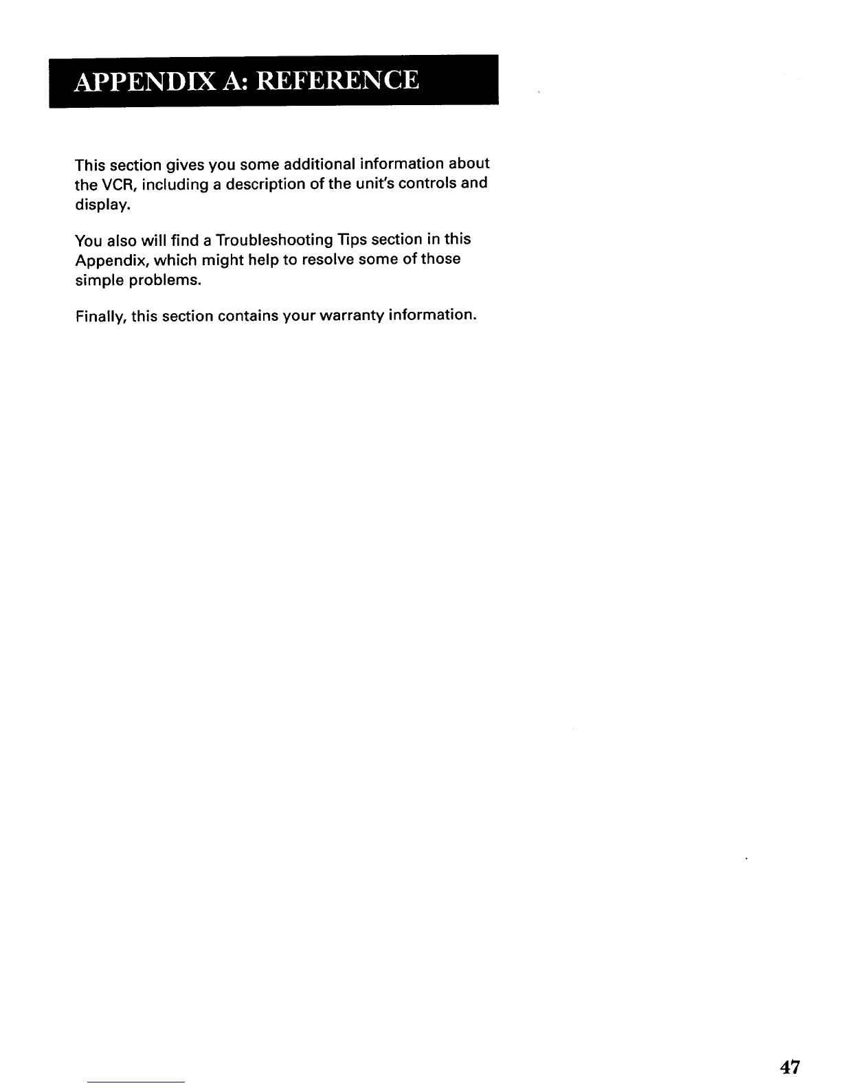 the VCR, including a description of the unit's controls and