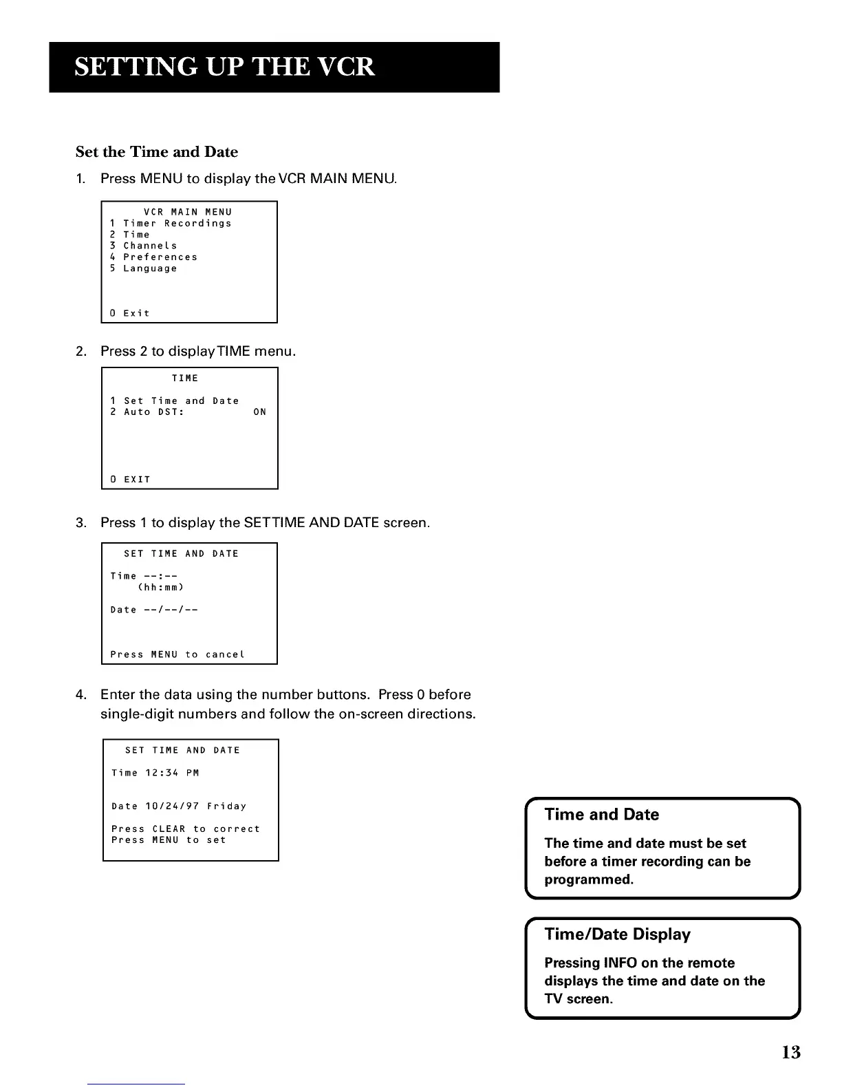 Press 1 to display the SETTIME AND DATE screen.