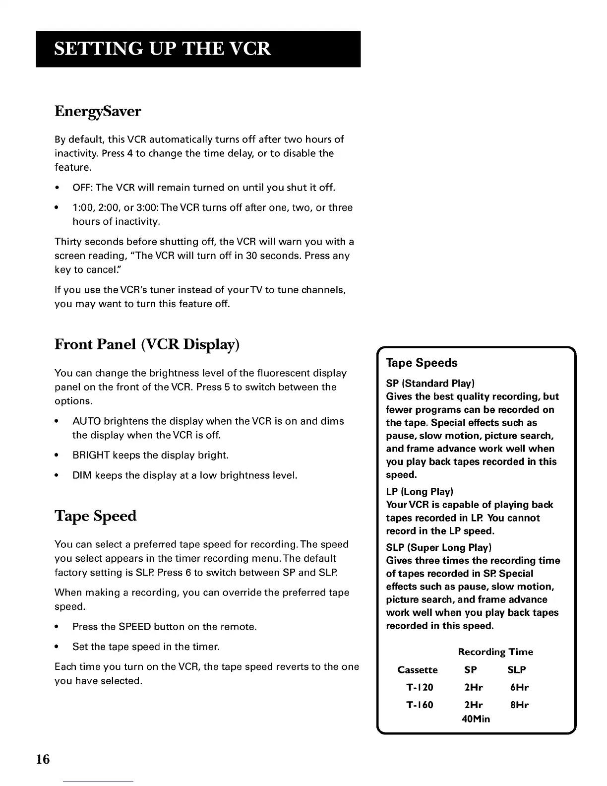 1:00, 2:00, or 3:00:The VCR turns off after one, two, or three