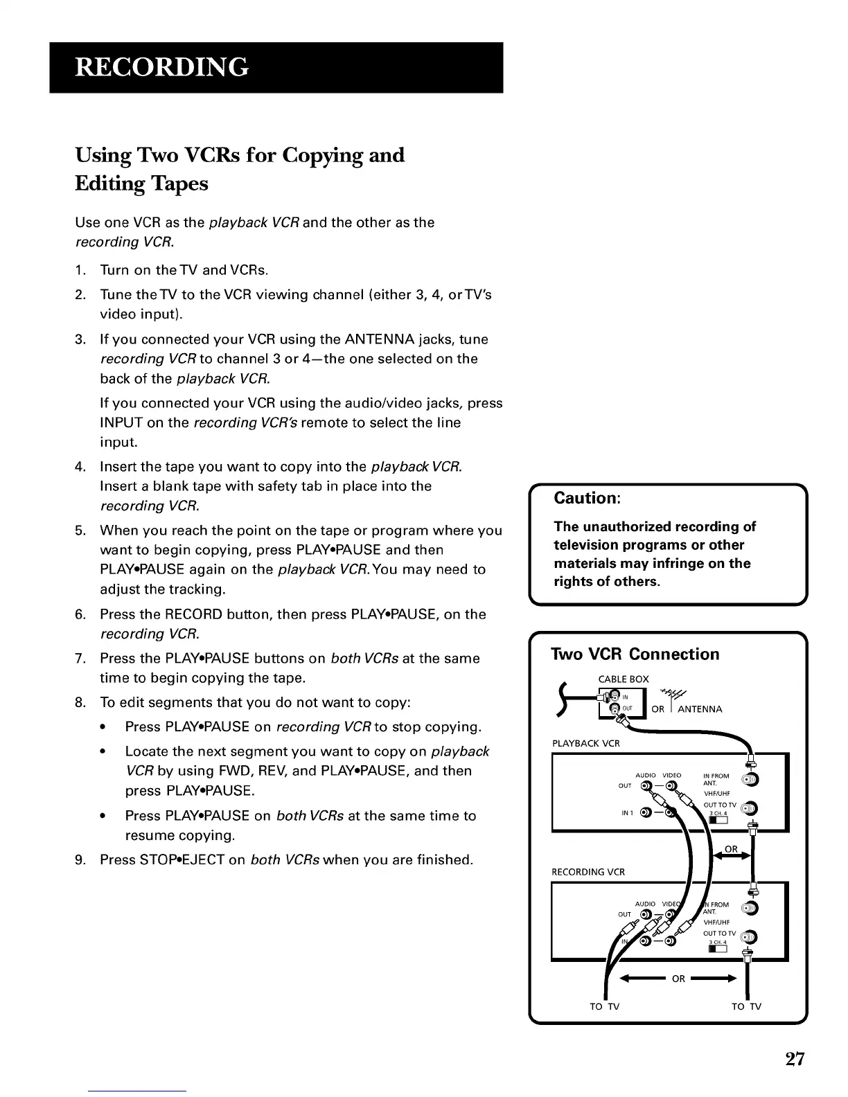 9. Press STOP•EJECT on both VCRs when you are finished.