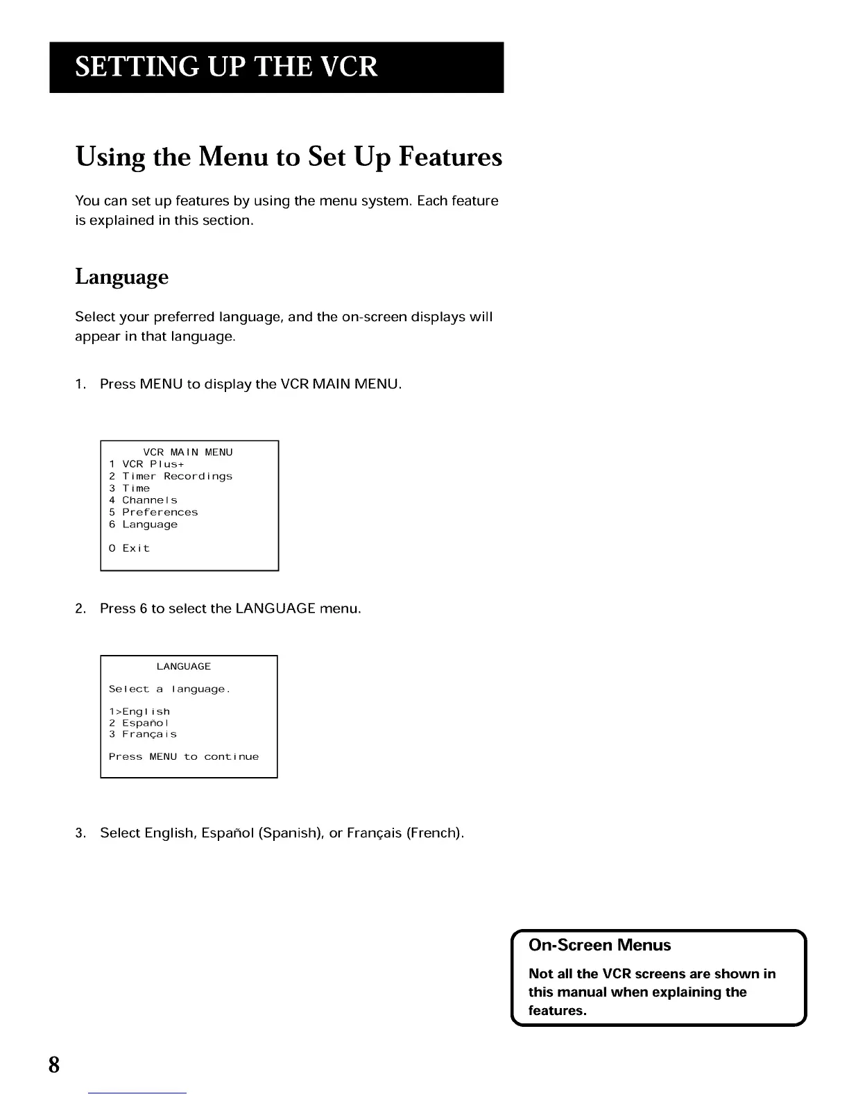 Not all the VCR screens are shown in