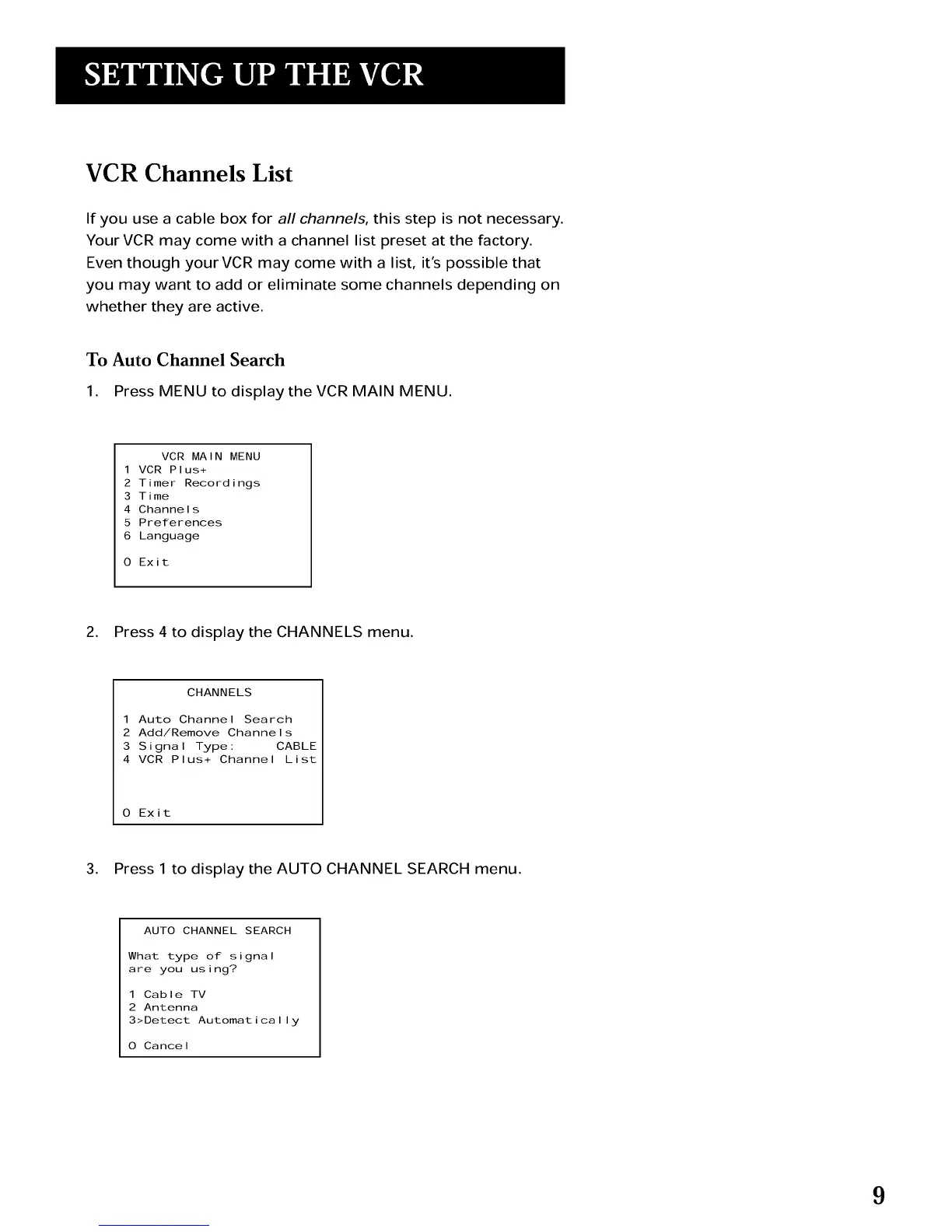 3. Press 1 to display the AUTO CHANNEL SEARCH menu.