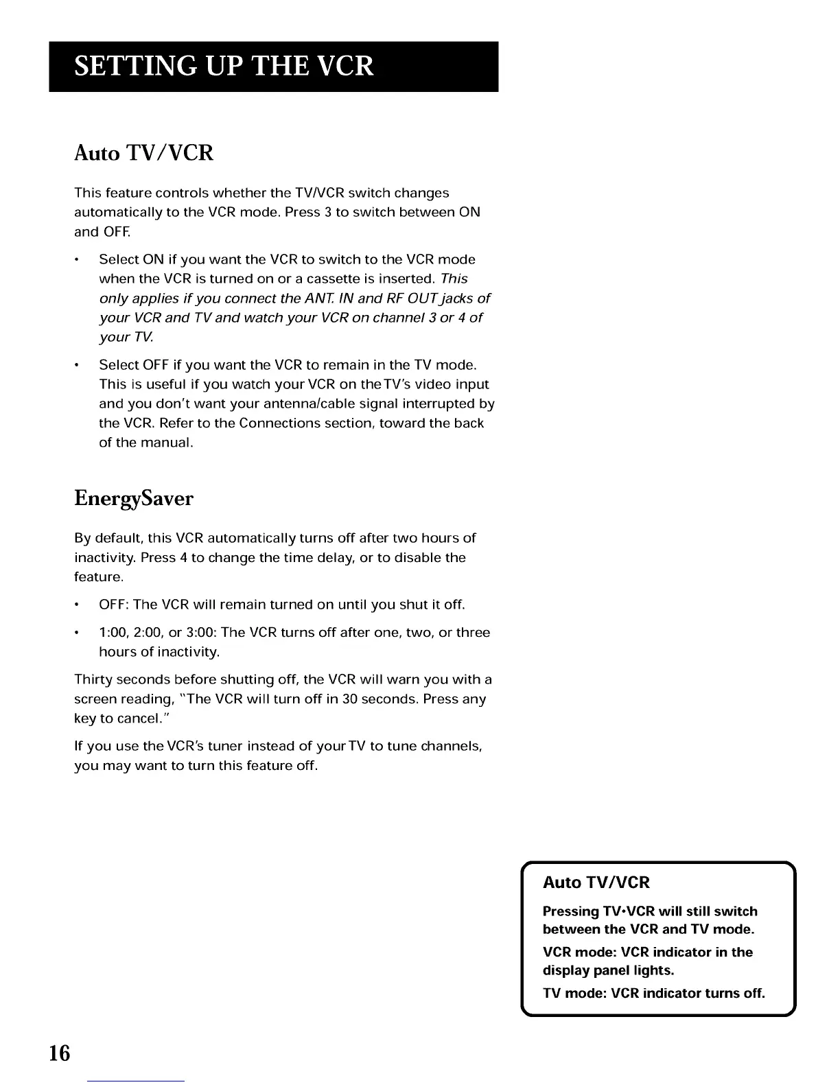 Select OFF if you want the VCR to remain in the TV mode.