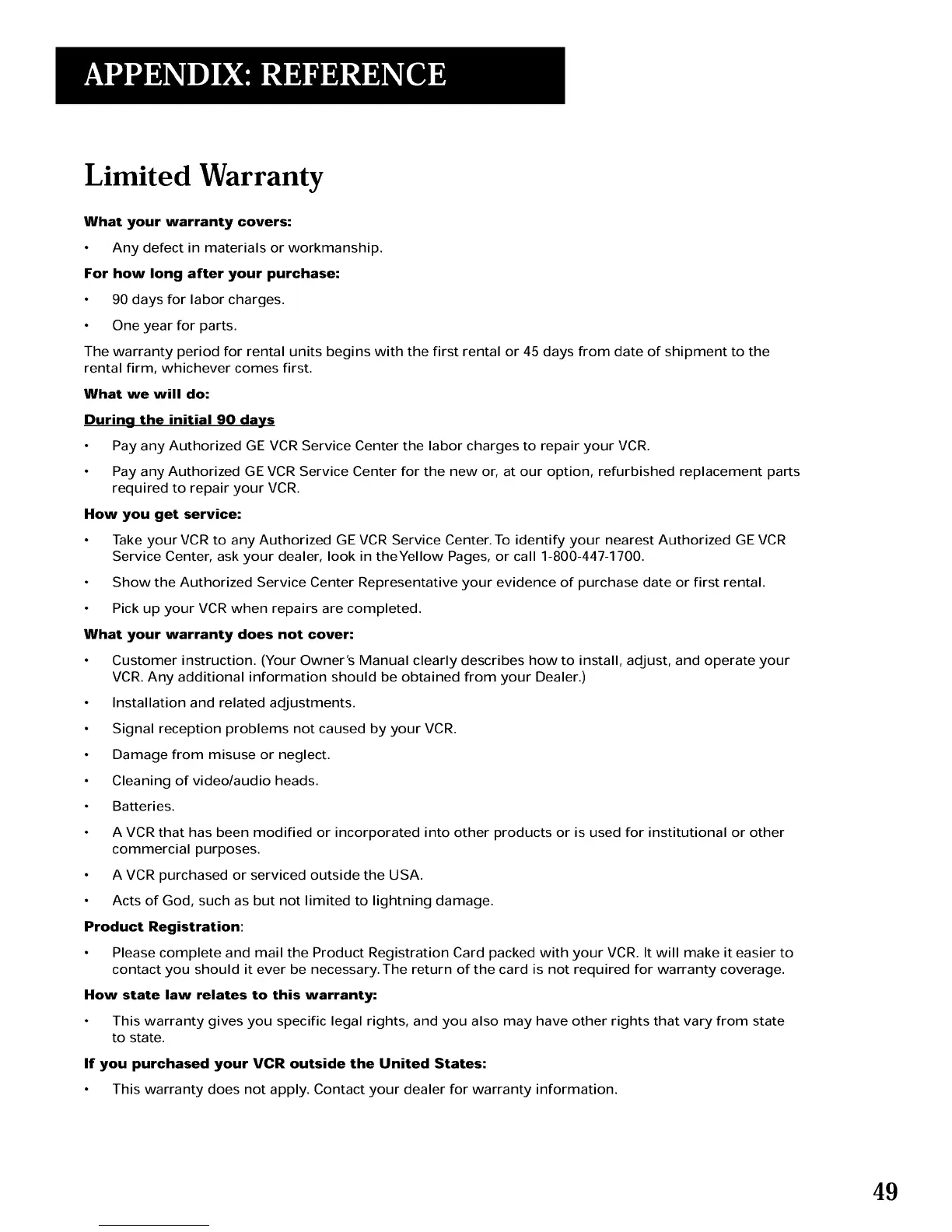 • Pay any Authorized GE VCR Service Center the labor charges to repair your VCR.
