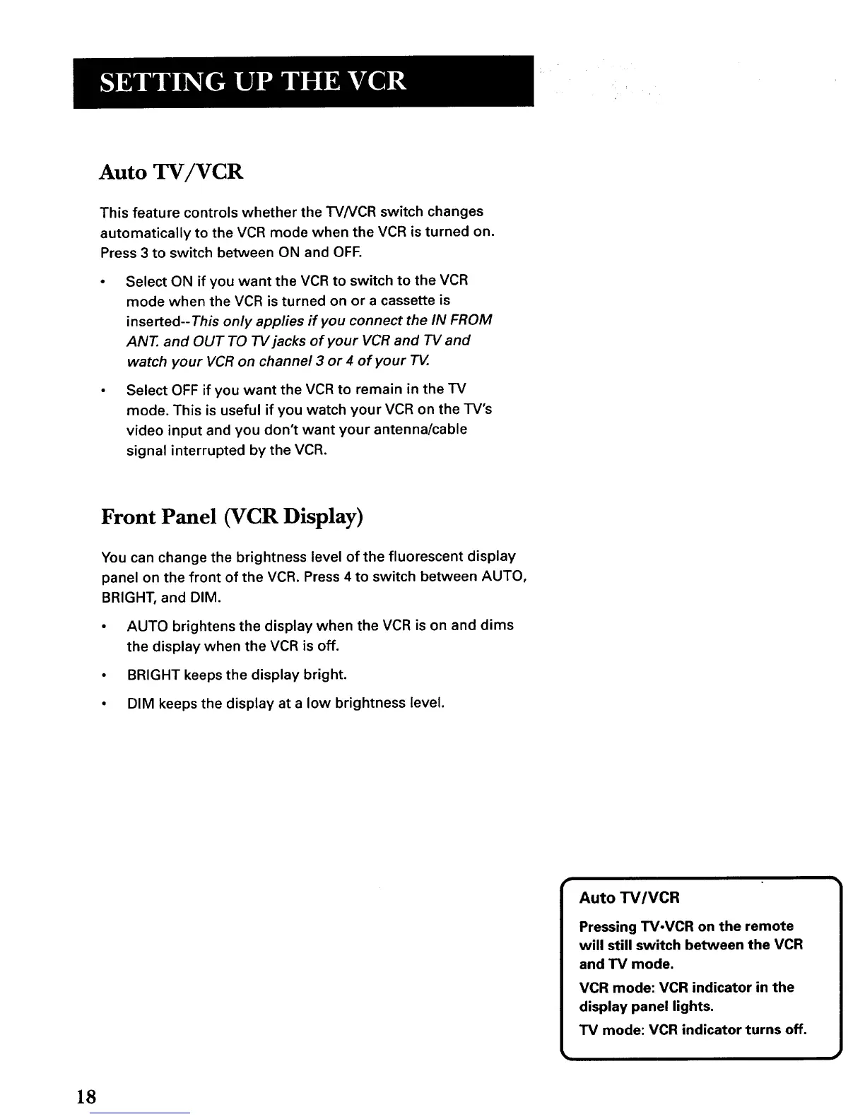 • AUTO brightens the display when the VCR is on and dims