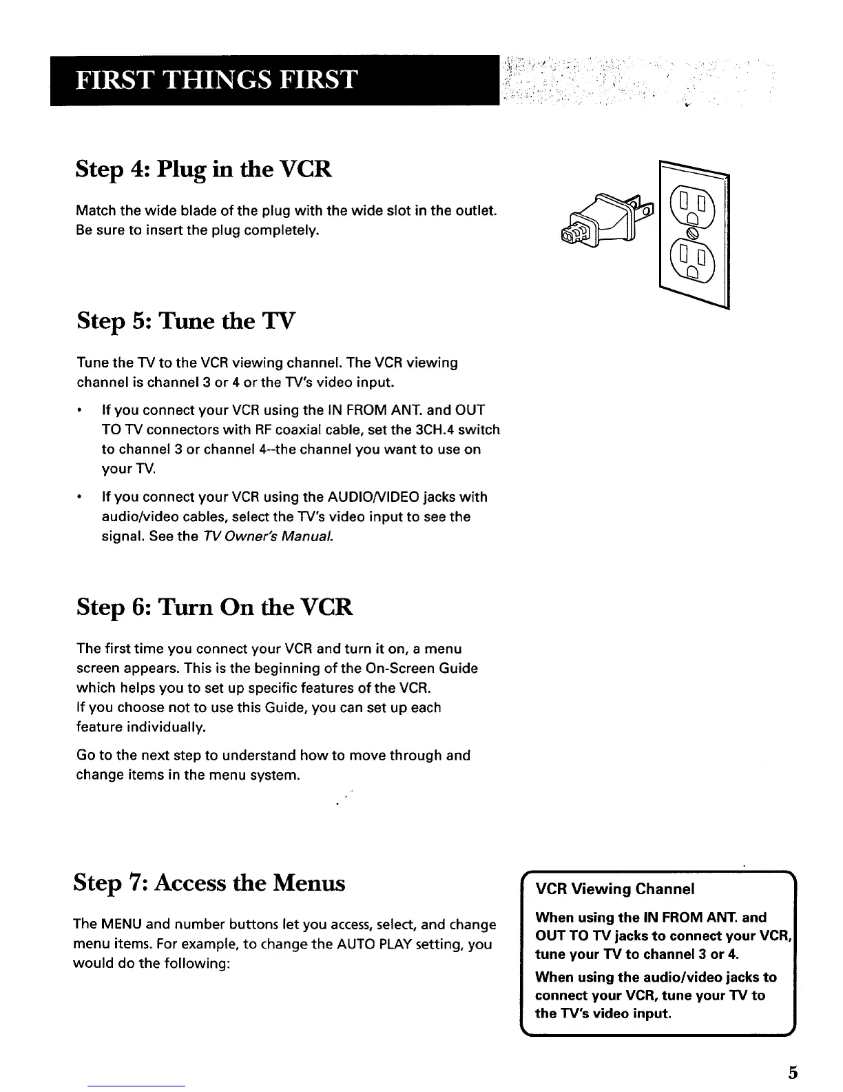 Tune the TV to the VCR viewing channel. The VCR viewing