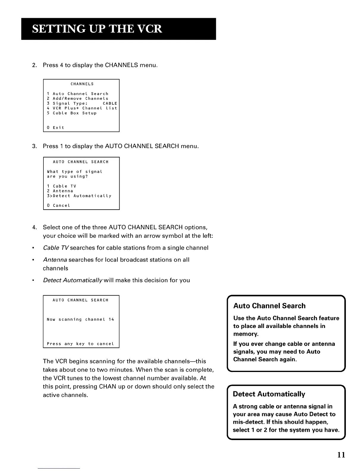 4. Select one of the three AUTO CHANNEL SEARCH options,