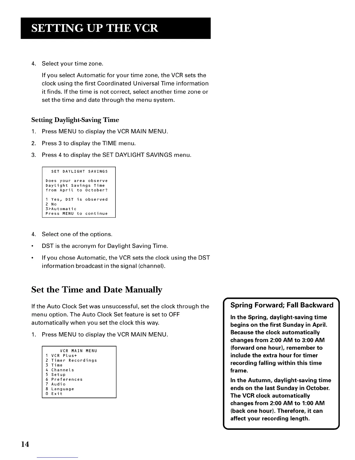 3. Press 4 to display the SET DAYLIGHT SAVINGS menu.