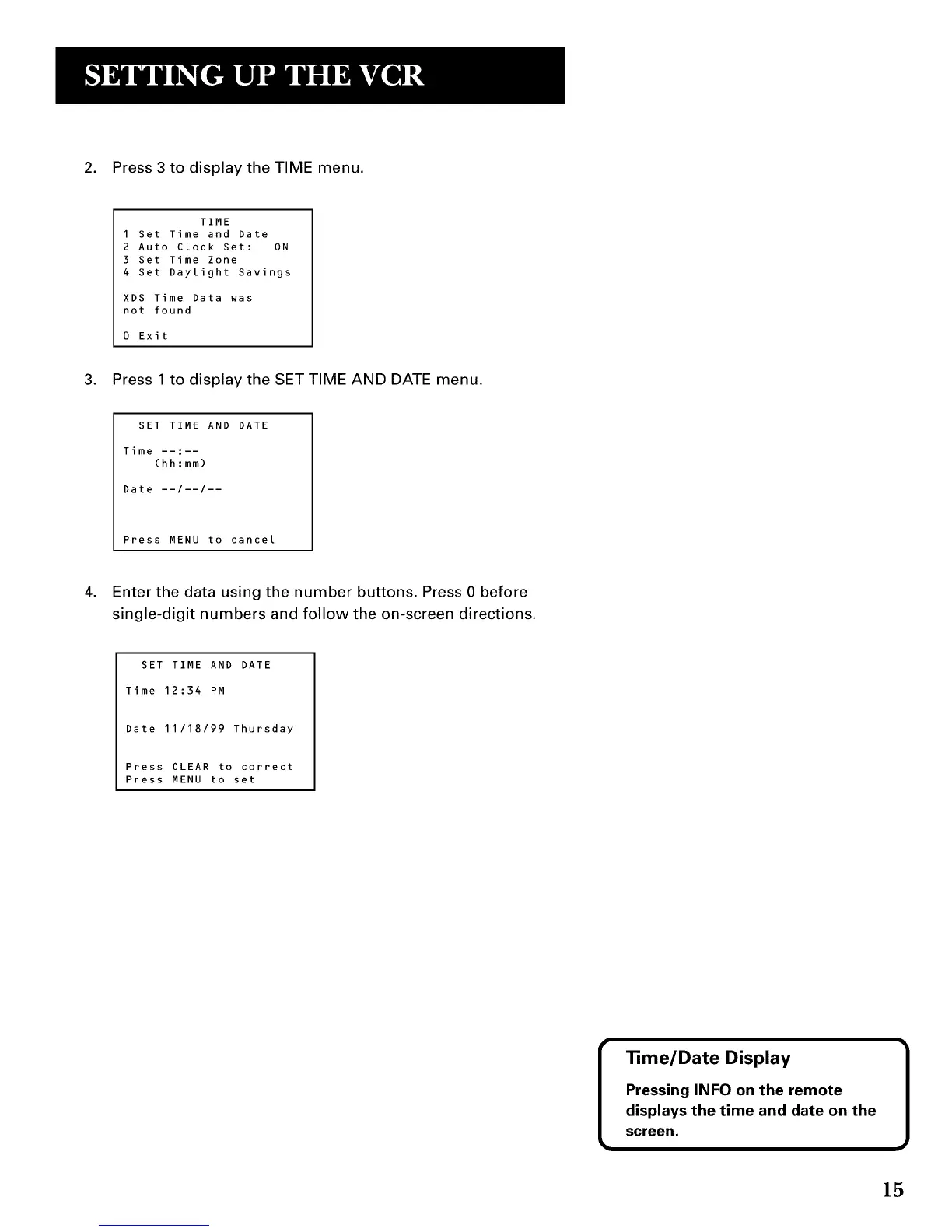 3. Press 1 to display the SET TIME AND DATE menu.