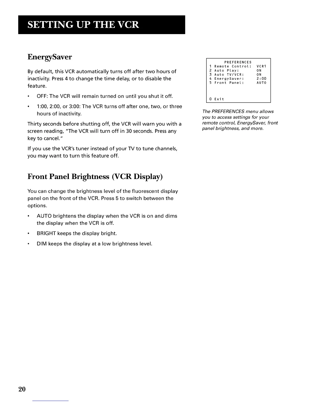 • AUTO brightens the display when the VCR is on and dims