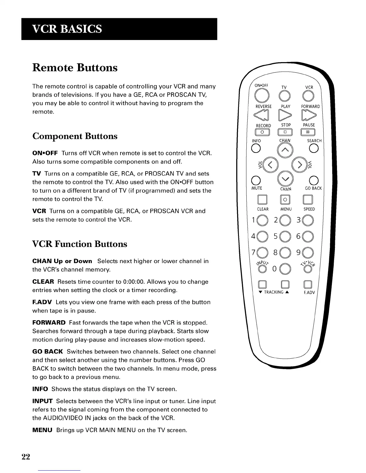 VCR Turns on a compatible GE, RCA, or PROSCAN VCR and