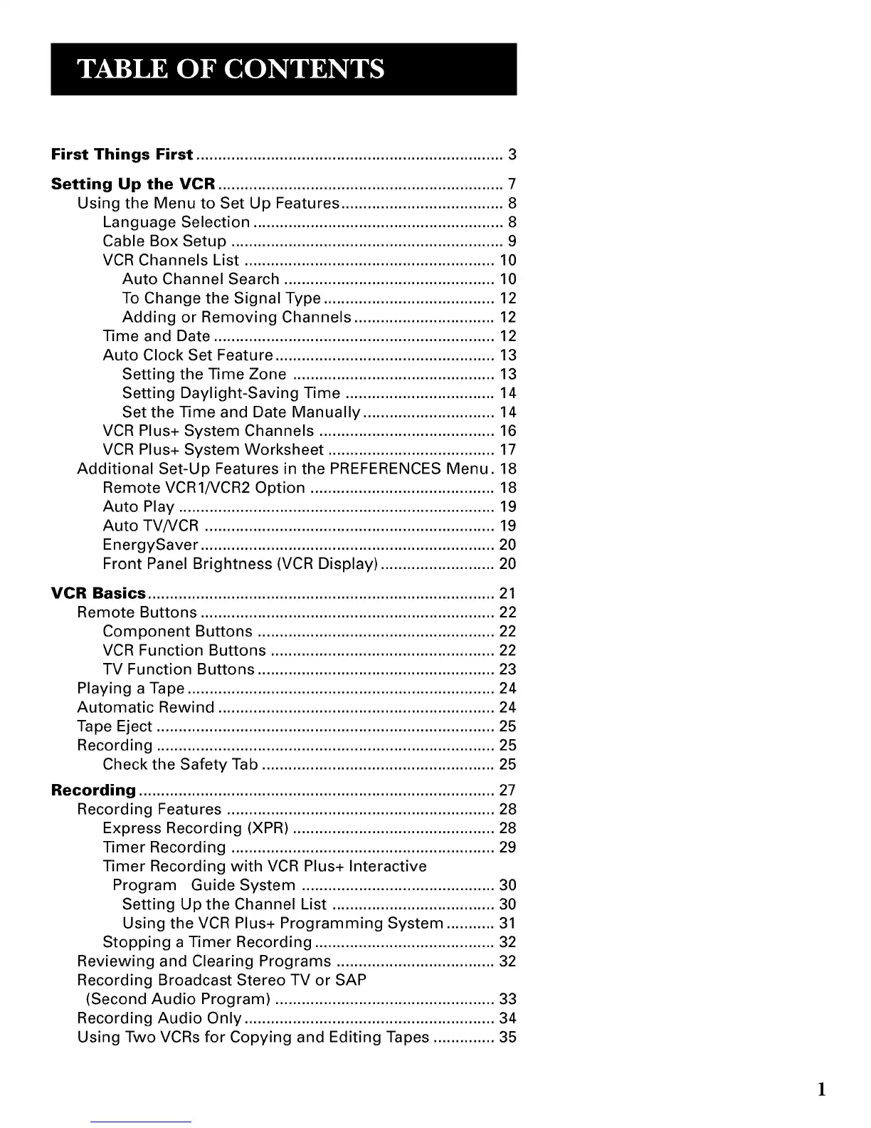VCR Channels List ......................................................... 10