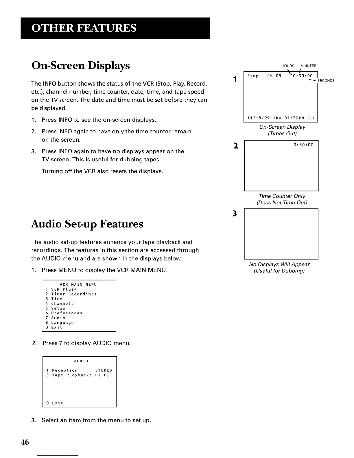 The INFO button shows the status of the VCR (Stop, Play, Record,