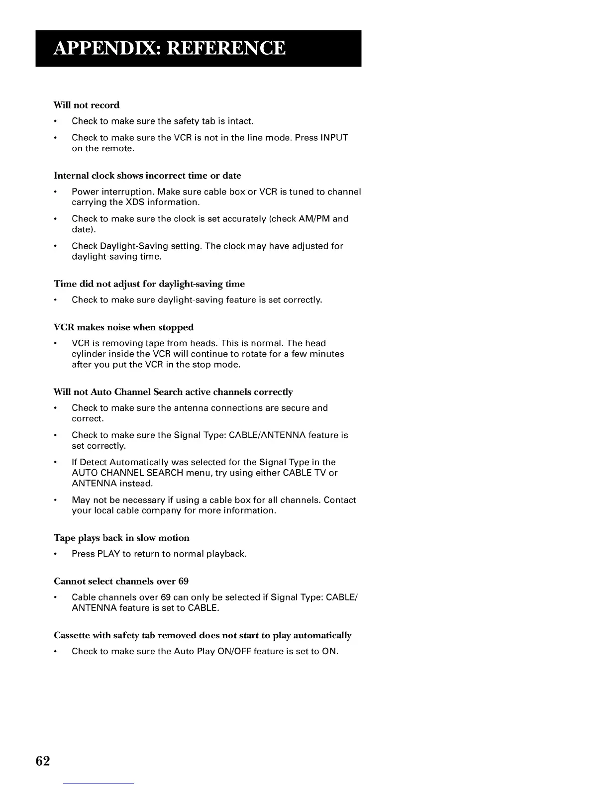 • Power interruption. Make sure cable box or VCR is tuned to channel