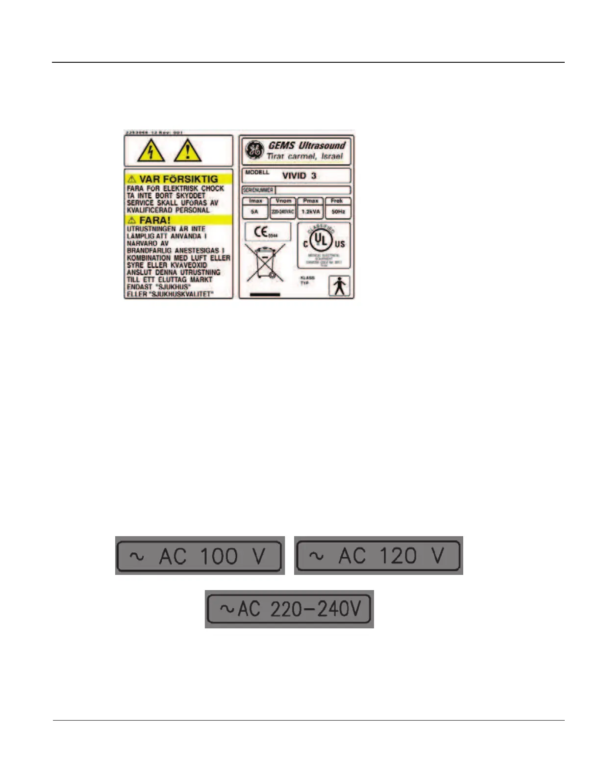 One of the rating labels shown below is located on the rear of the ultrasound unit, as shown in