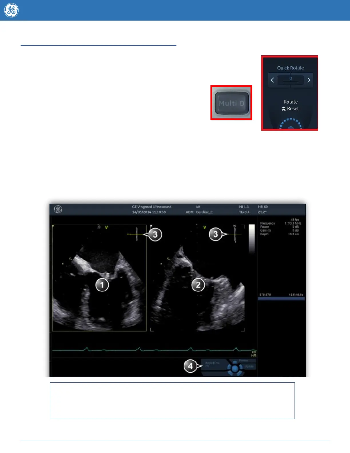 angle of Scan Plane 1 is represented by a yellow line on the on screen navigator (3). Adjustments to the “Rotate”
