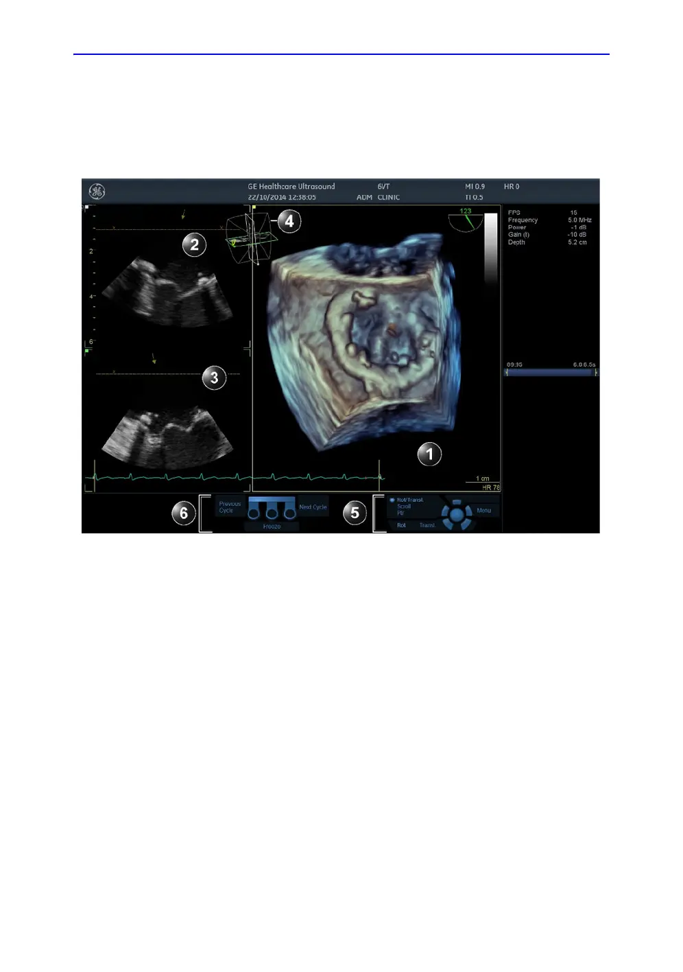 4. Orientation window: displays a three-dimensional scene with acquisition sector and 2D image positions.
