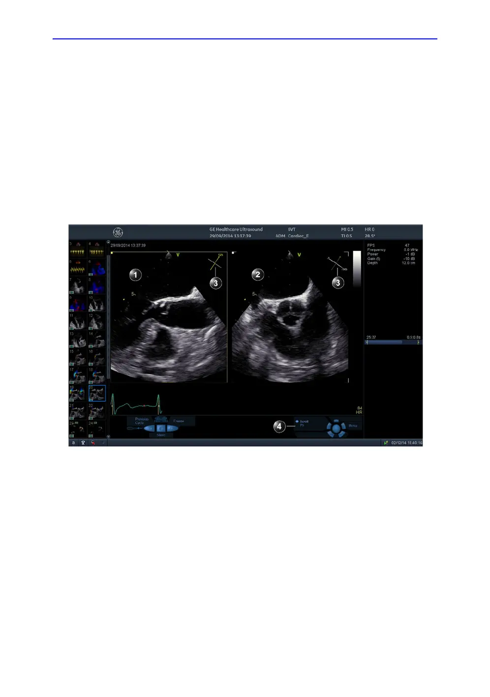 3. Navigator: displays the position of both scan planes as seen from the probe. The rotation angle for scan
