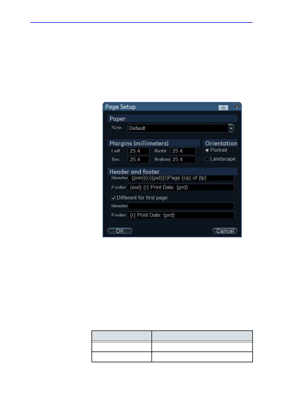 3. Define the header and footer for the printed report, by typing