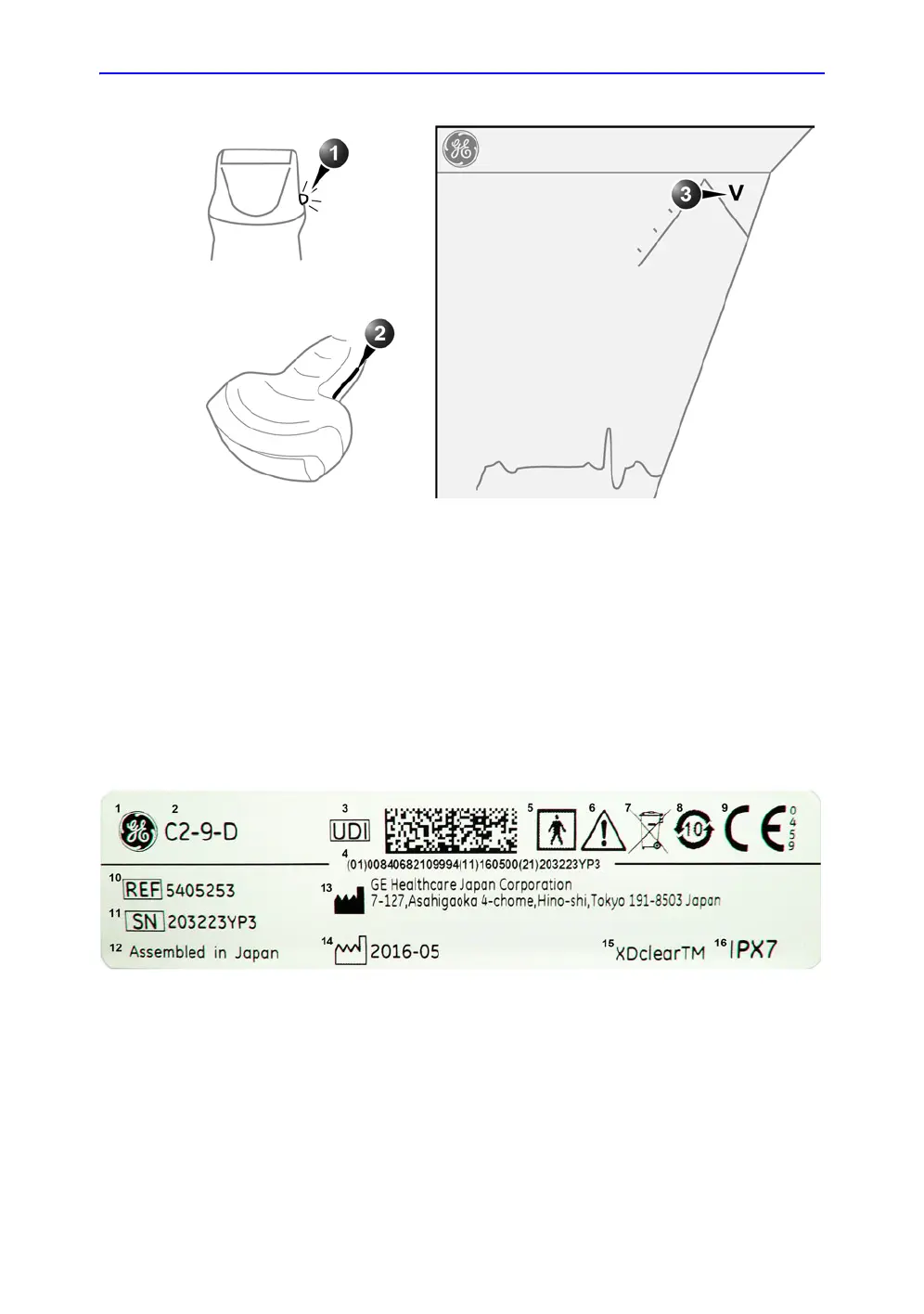 3. V-mark on screen: indicates the orientation of the probe to the scan.