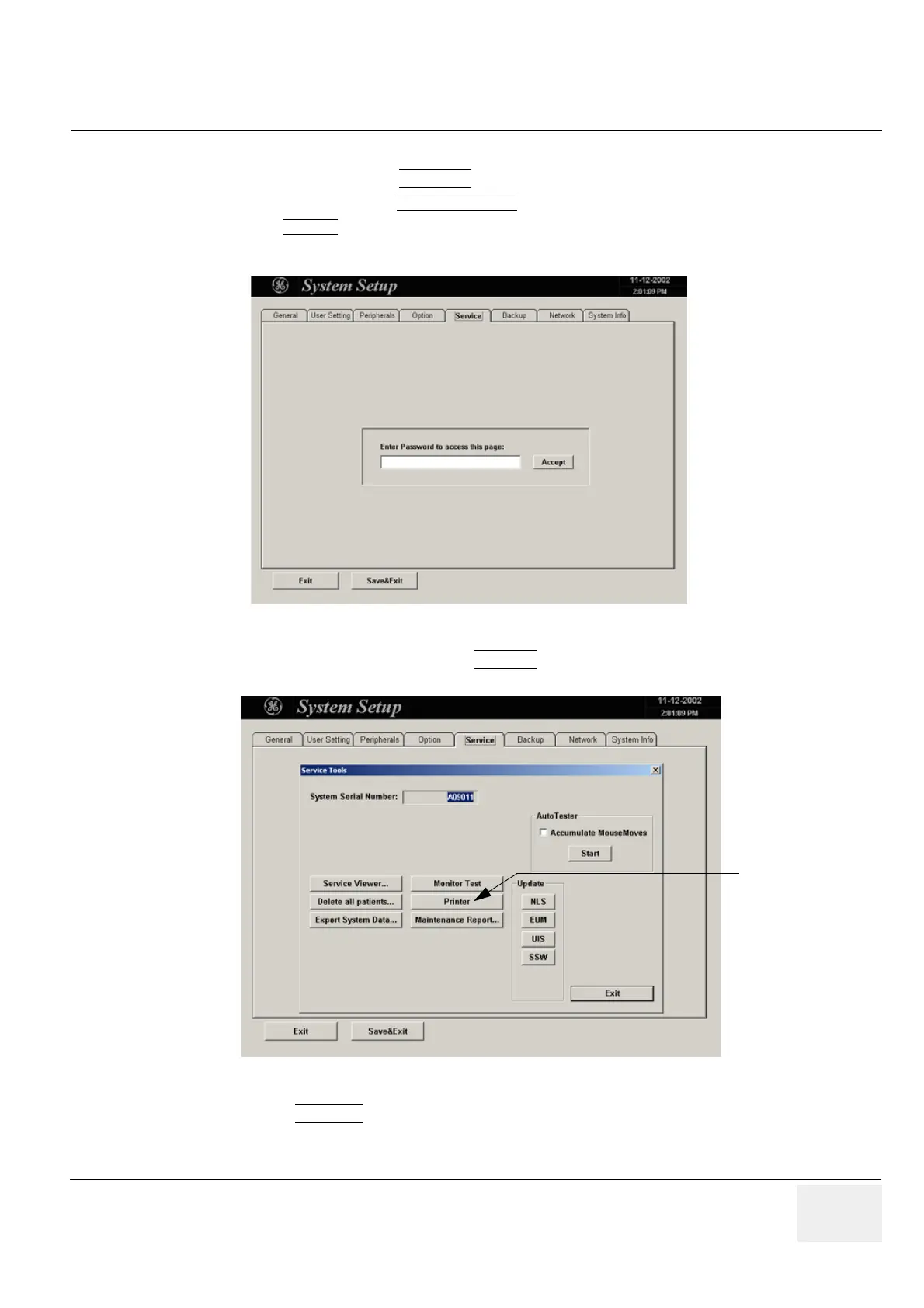 SERVICE page. The “password window” appears automatically.