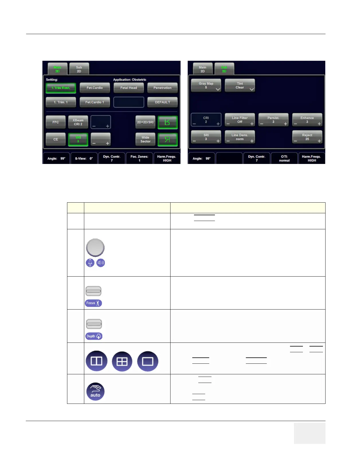 To select the depth position of the actual focus zone(s). Arrows at the left
