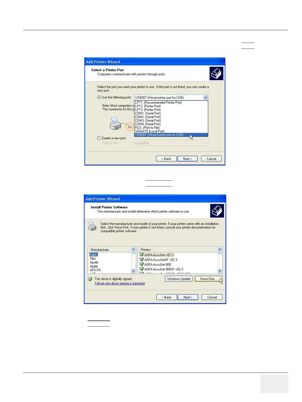 7.) Select the corresponding Printer Port (e.g., Figure 3-41 = USB001) and click NEXT